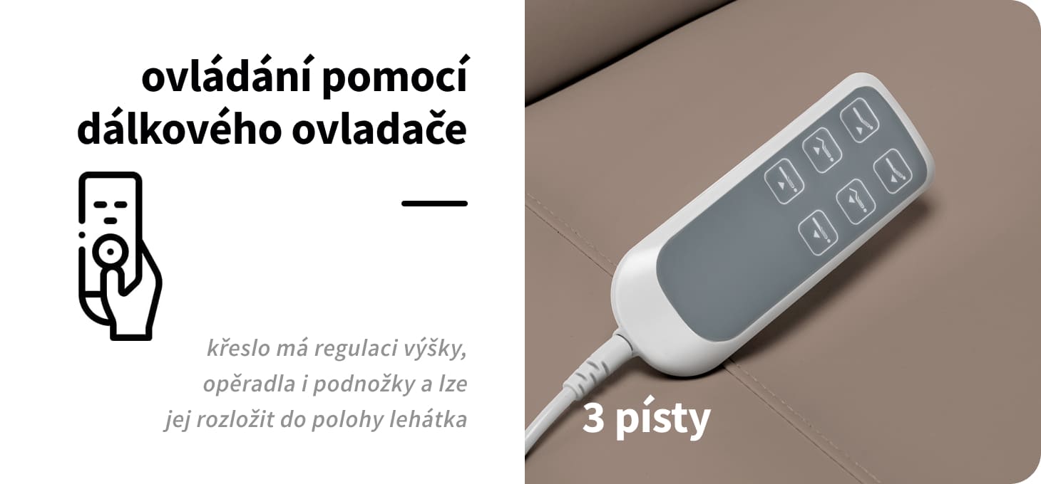 | Funkce | Elektrický, Ovládání dálkovým ovladačem, Nastavení opěrky hlavy, Nastavení opěrky nohou, Nastavení opěradla, Nastavení výšky, Bez koleček, 3 aktuátory, eko kůže |