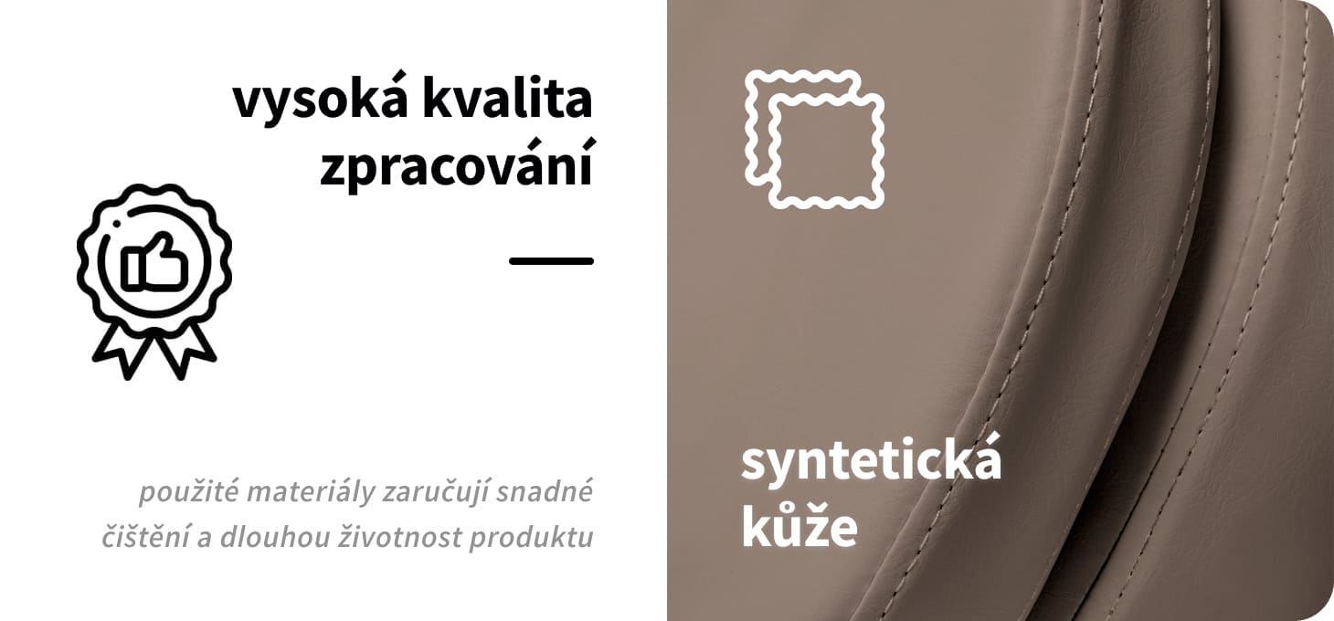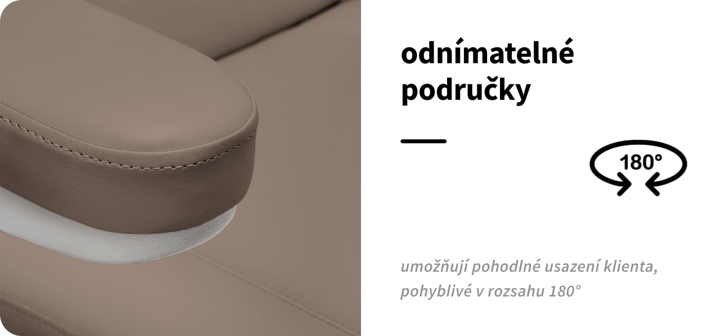 Křeslo je vyplněno tvarovanou pěnou a potaženo na dotek příjemnou syntetickou kůží v odstínech hnědé barvy. Díky použitému materiálu se zařízení snadno čistí a je odolné vůči vlhkosti a vybraným dezinfekčním prostředkům. Pevná základna z odolného materiálu v odstínech bílé zajišťuje stabilitu při ošetření. Vhodně tvarované lemy dodávají křeslu stylový vzhled a zajišťují ergonomii sedadla. Díky minimalistickému, jednoduchému designu a klasickým barvám se hodí do každého interiéru.