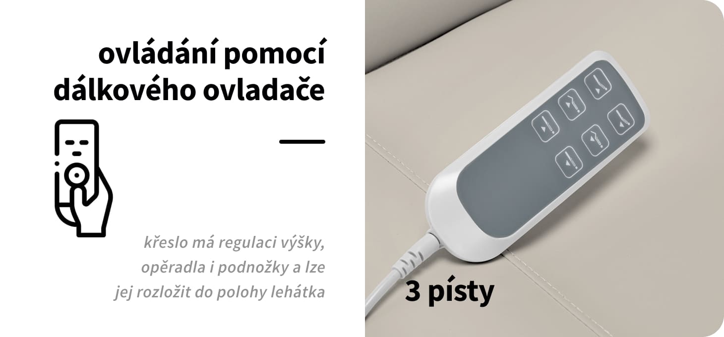 | Funkce | Elektrický, Ovládání dálkovým ovladačem, Nastavení opěrky hlavy, Nastavení opěrky nohou, Nastavení opěradla, Nastavení výšky, Bez koleček, 3 aktuátory, eko kůže |