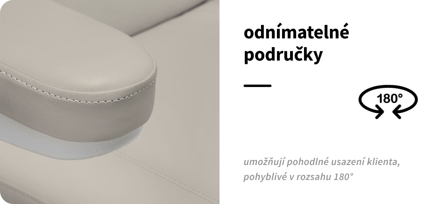 Široké sedadlo zajišťuje pohodlí při dlouhých ošetřeních. Způsob tvarování pěny dává křeslu ergonomický tvar a umožňuje tělu pohodlně sedět v sedadle, což zajišťuje vysokou úroveň pohodlí a správnou oporu páteře. Zařízení lze rozložit do polohy lehátka a díky skrytému otvoru v opěrce hlavy pod polštářem je ideální také pro ošetření zad nebo masáže.
