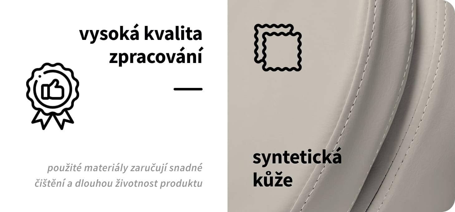 Křeslo je vyplněno tvarovanou pěnou a potaženo na dotek příjemnou syntetickou kůží v odstínech béžové barvy. Díky použitému materiálu se zařízení snadno čistí a je odolné vůči vlhkosti a vybraným dezinfekčním prostředkům. Pevná základna z odolného materiálu v odstínech bílé zajišťuje stabilitu při ošetření. Vhodně tvarované lemy dodávají křeslu stylový vzhled a zajišťují ergonomii sedadla. Díky minimalistickému, jednoduchému designu a klasickým barvám se hodí do každého interiéru.