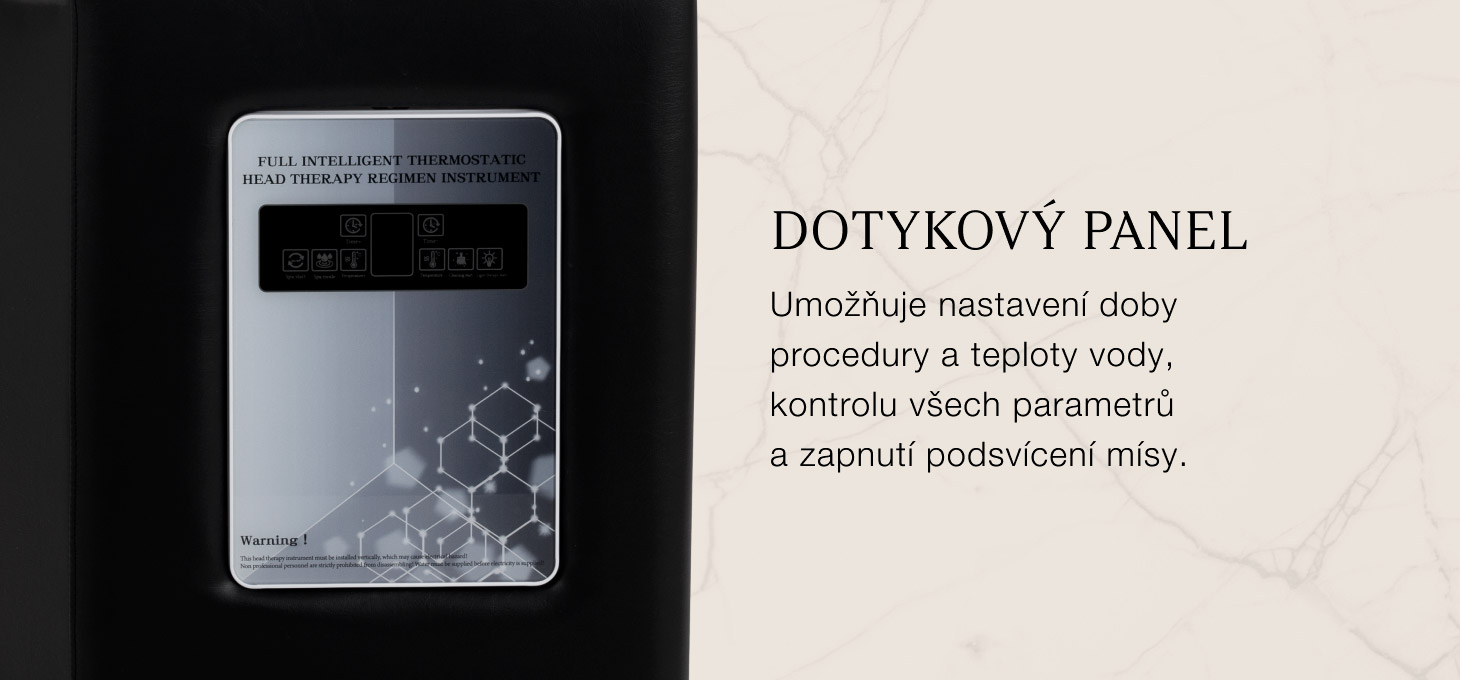 Intuitivní dotykový panel poskytuje plnou kontrolu nad parametry ošetření a zajišťuje pohodlné používání a snadnou obsluhu. Umožňuje nastavit čas, teplotu a intenzitu vodního proudu - na výběr jsou tři režimy: jemný, komfortní a silný. Lze jej také použít k aktivaci funkce světelné terapie, tj. podsvícení mísy, které vytváří relaxační atmosféru a podporuje regeneraci. Dálkové ovládání navíc umožňuje ovládat přístroj pro parní terapii z libovolného místa v salonu.