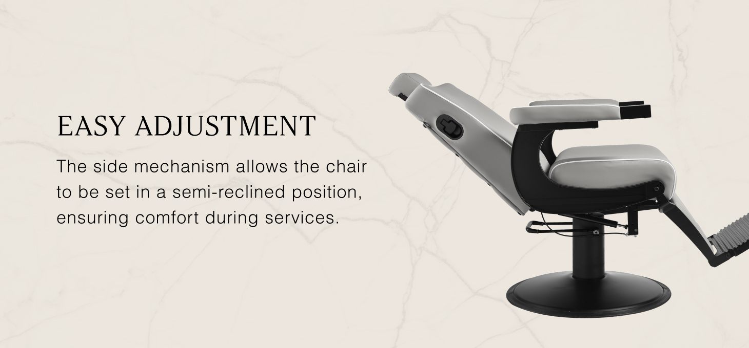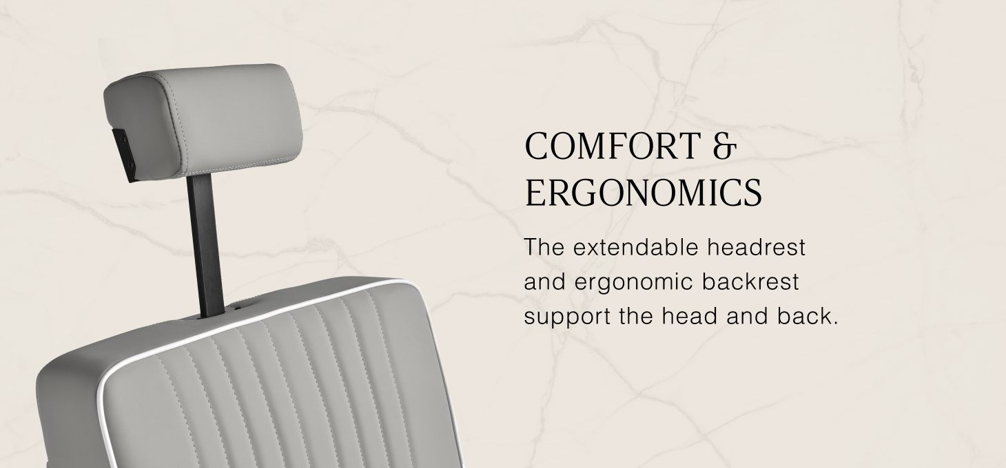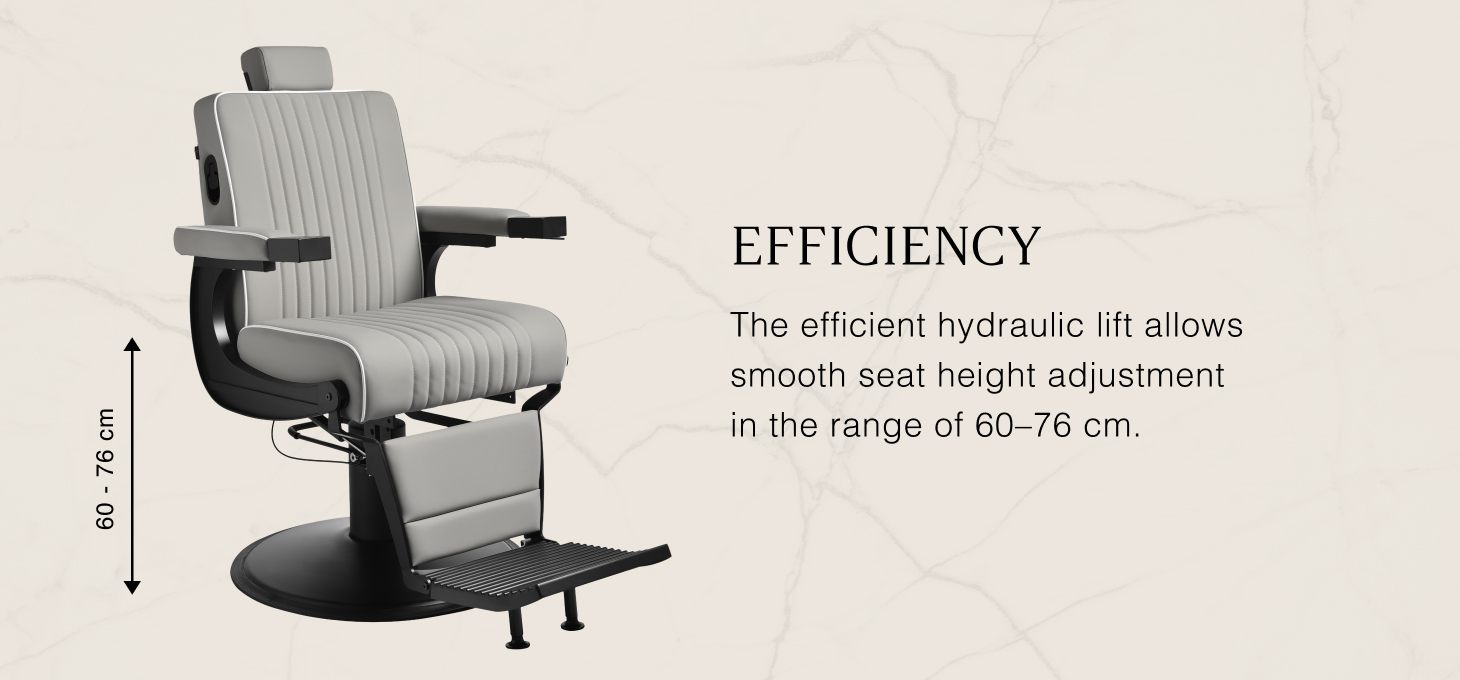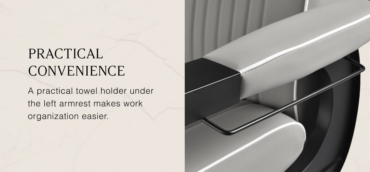 Sedadlo vyplněné měkkou pěnou poskytuje pohodlí i při dlouhých ošetřeních, zatímco ergonomicky profilovaná opěrka zad podpírá záda. Plně otočný mechanismus zvyšuje volnost pohybu a umožňuje snadný přístup ze všech stran, což stylistovi usnadňuje práci. Čalouněné područky nastavené v optimální výšce podporují přirozenou polohu paží a snižují napětí v ramenou a krku. Další vymožeností je praktický držák ručníků umístěný pod levou područkou, který usnadňuje organizaci práce.