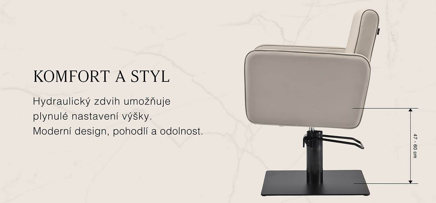 Odolný hydraulický zvedák umožňuje plynulé nastavení výšky sedadla v rozmezí 47 až 60 cm - i když klient sedí v křesle. Práce je tak ergonomičtější a polohu lze snadno nastavit tak, aby vyhovovala výšce klienta i kadeřníka. Pohodlné opěradlo poskytuje stabilní oporu zad a usnadňuje pohodlnou polohu, což je důležité zejména při dlouhých ošetřeních, a zvyšuje tak pohodlí a spokojenost klienta.