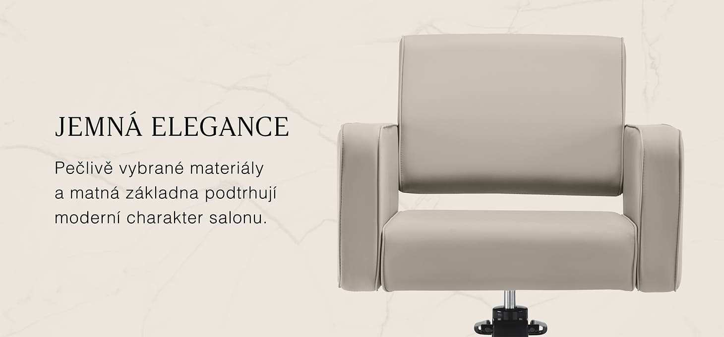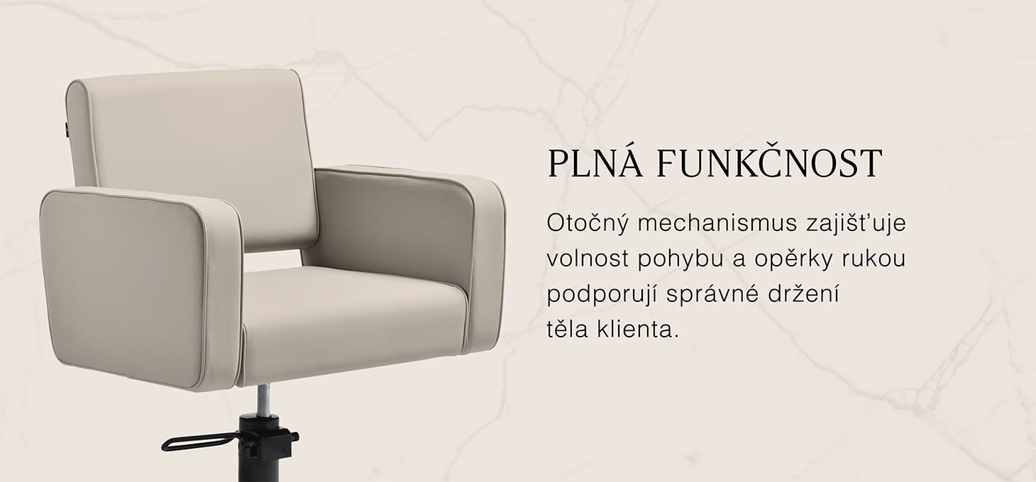 Sedadlo zaručuje pohodlí i při dlouhých ošetřeních. Ergonomické područky podporují správné držení těla klienta, zajišťují pohodlí a usnadňují přesné střihy a styling. Plně otočný mechanismus zajišťuje větší mobilitu a volnost pohybu, díky čemuž je práce kadeřníka plynulejší, efektivnější a méně stresující. Další vymožeností je praktický otvor mezi opěradlem a sedákem, který usnadňuje čištění a rychlé odstraňování chloupků z těžko přístupných míst. To umožňuje efektivní a hygienickou přípravu stanoviště pro dalšího klienta.