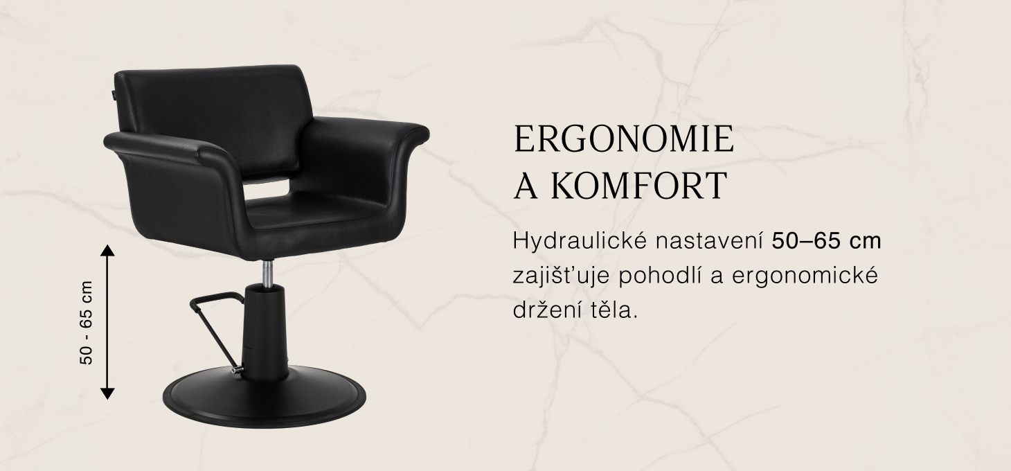 Robustní hydraulický zdvih umožňuje plynulé nastavení výšky sedadla v rozmezí 50 až 65 cm - a to i v případě, že klient sedí. Díky tomu lze polohu snadno přizpůsobit výšce klienta i stylisty, což podporuje ergonomické držení těla při práci. Pohodlné opěradlo poskytuje stabilní oporu zad a zajišťuje pohodlí i při dlouhých ošetřeních. Plně otočný mechanismus zvyšuje volnost pohybu a umožňuje snadný přístup ke klientovi ze všech stran.