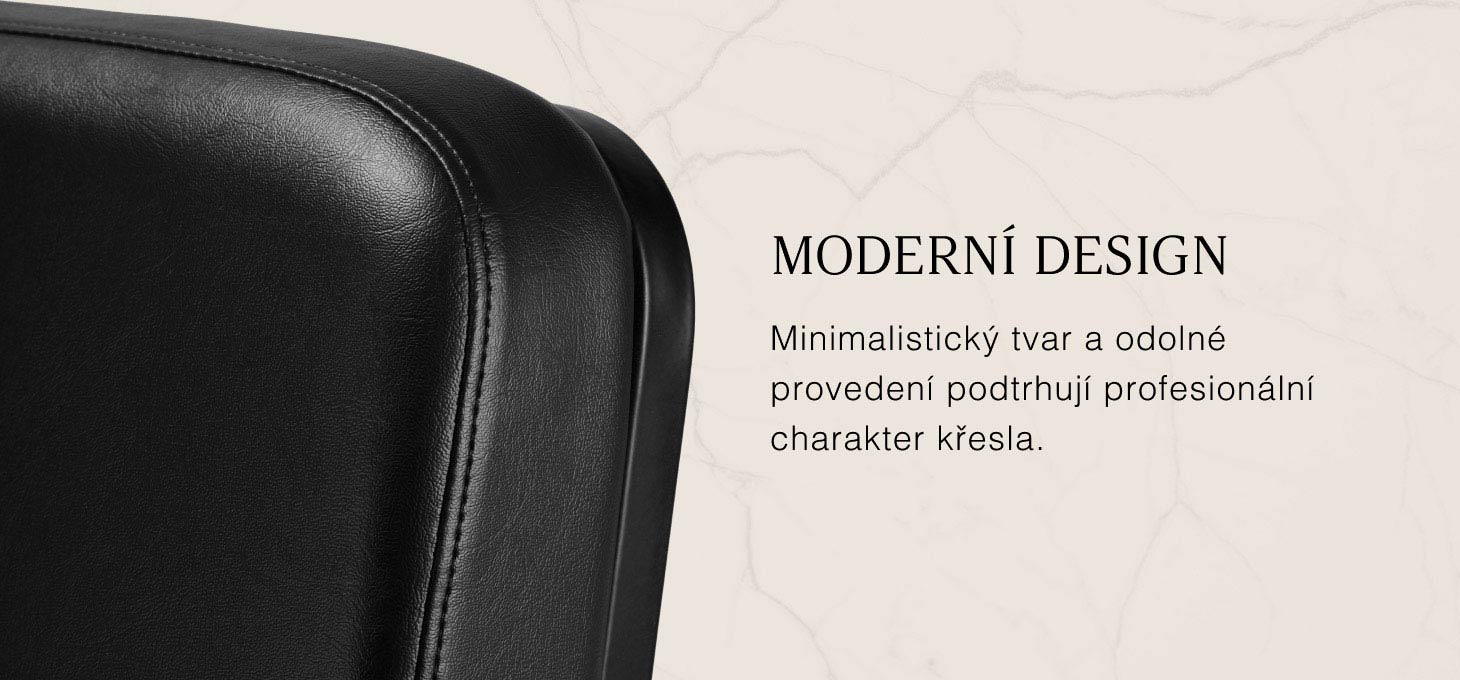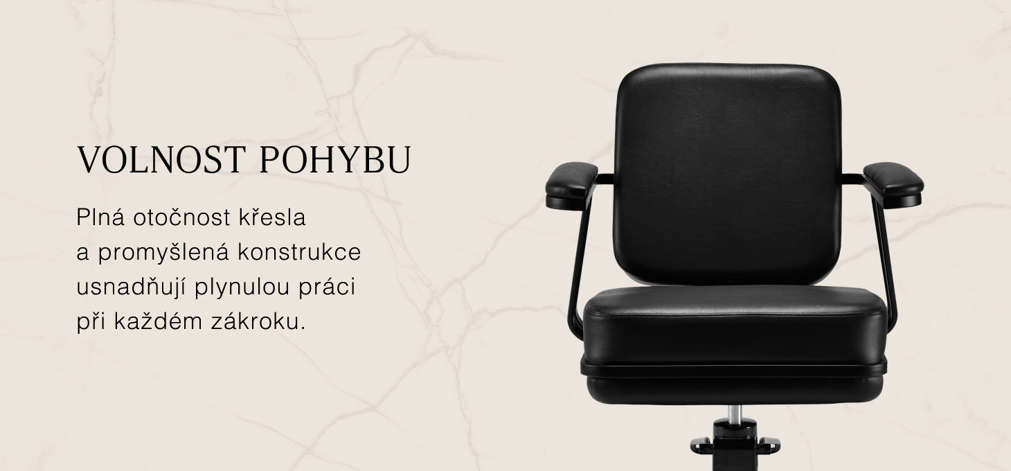 Konstrukce křesla byla navržena s ohledem na pohodlí i při delších procedurách. Profilované sedadlo a ergonomické područky podporují přirozenou polohu zákazníka a usnadňují kadeřníkovi precizní práci. Mechanismus plného otočení zvyšuje rozsah pohybu a volnost manévrování, což se promítá do plynulosti a efektivity služeb.