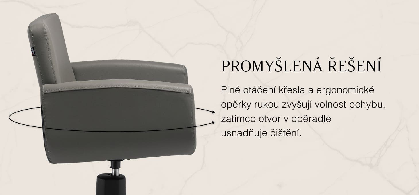 Ergonomické područky podporují správné držení těla klienta, zajišťují pohodlí a usnadňují přesné stříhání a styling. Plně otočný mechanismus zajišťuje větší pohyblivost a volnost pohybu, díky čemuž je kadeřnická práce plynulejší, efektivnější a méně namáhavá. Praktický otvor mezi opěradlem a sedákem usnadňuje čištění a rychlé odstraňování chloupků z těžko přístupných míst. To umožňuje efektivní a hygienickou přípravu salonu pro dalšího klienta.