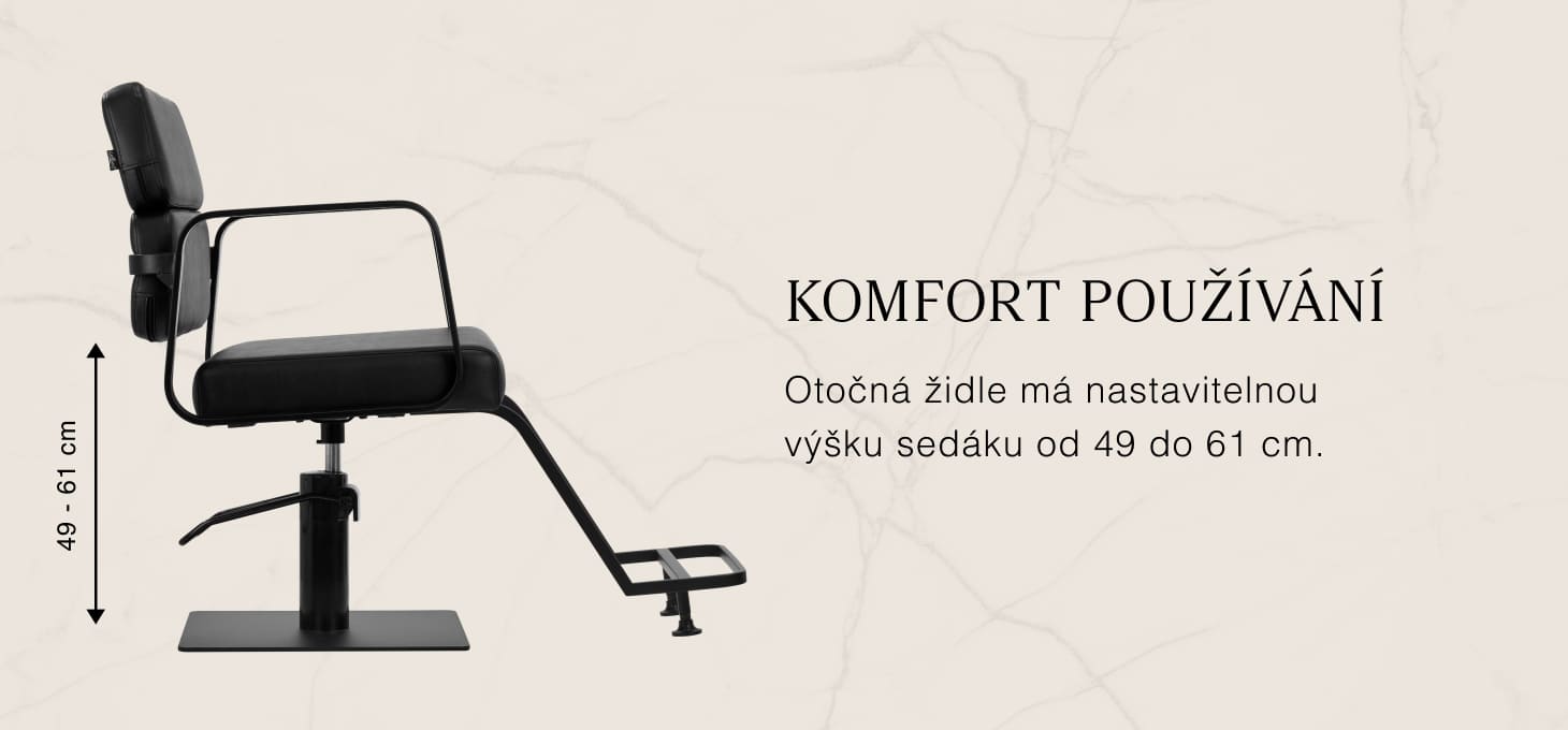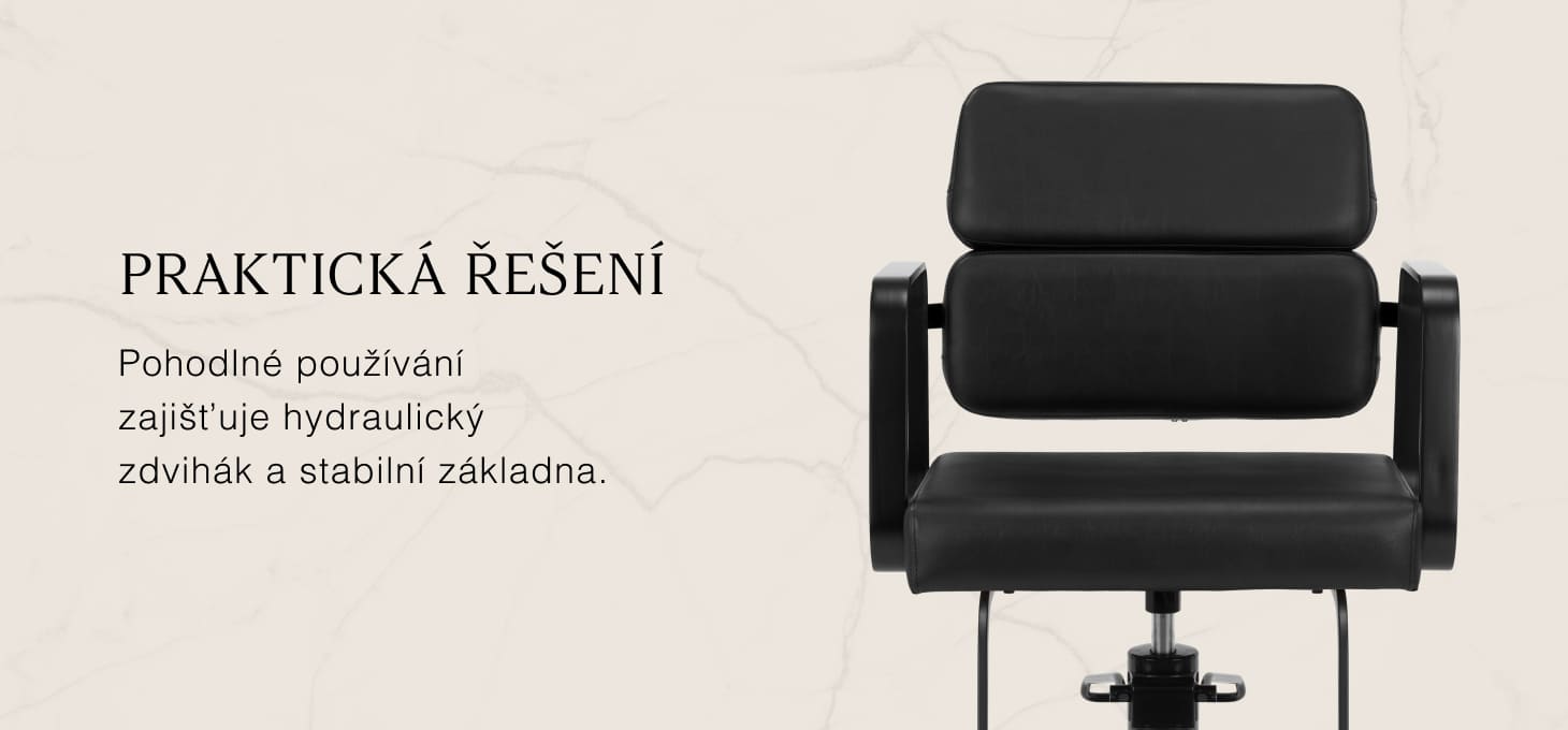 Odolný hydraulický zvedák umožňuje nastavit výšku sedadla v rozmezí 49-61 cm - a to i v případě, že klient na židli sedí. Poskytuje ergonomičtější pracovní prostředí, protože umožňuje nastavit úroveň sedadla podle výšky klienta i kadeřníka. Vizuálně zajímavé opěradlo umožňuje pohodlnou polohu a poskytuje vynikající oporu zad, což je důležité zejména při několikahodinových ošetřeních. Velkým plusem tohoto modelu je otvor ponechaný mezi opěradlem a sedákem. Usnadňuje udržování čistoty v salonu, protože umožňuje snadné vymetení vlasů ze všech koutů křesla. To usnadňuje přípravu pracoviště mezi jednotlivými klienty.