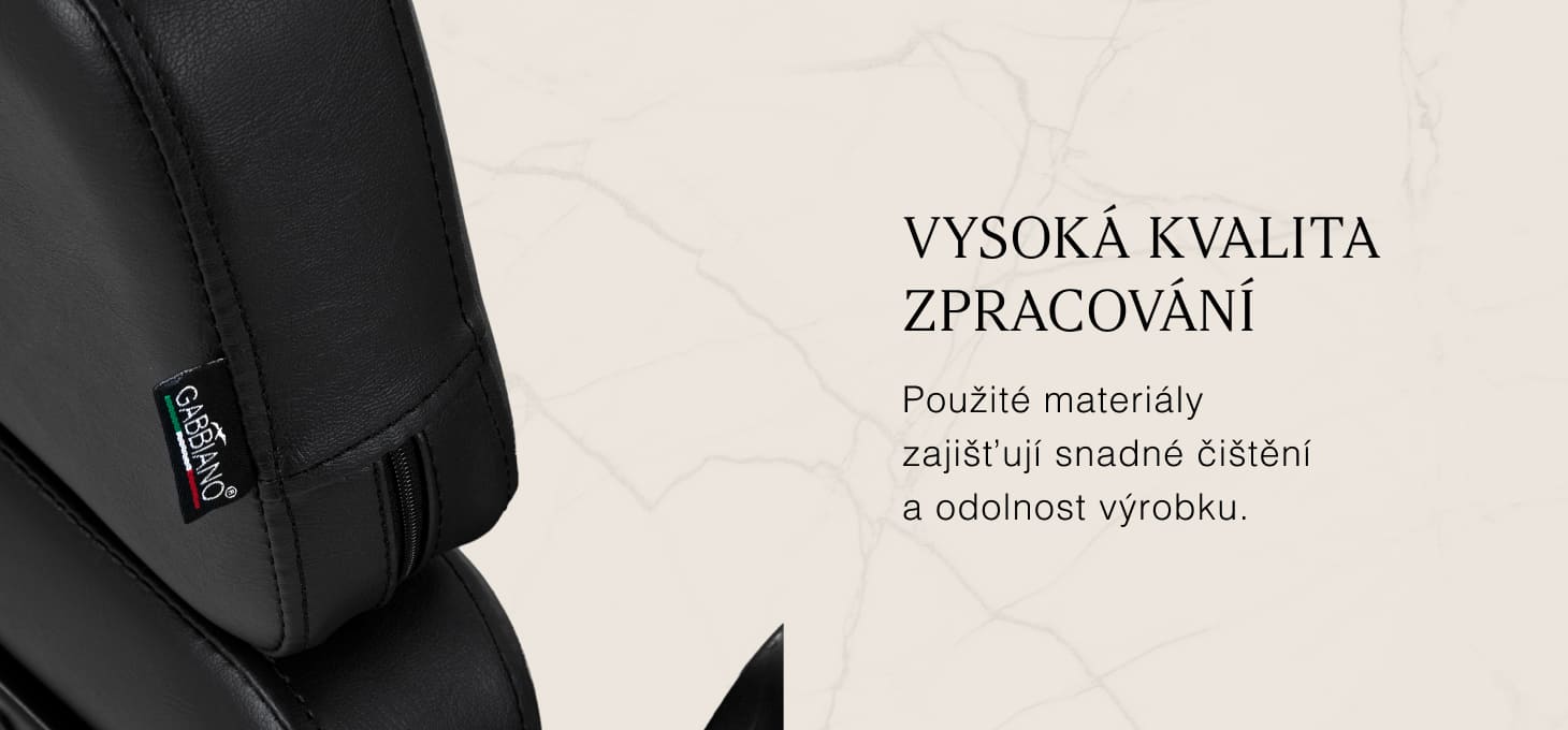 Polstrování z odolné pěny odolné proti deformacím a čalounění z na dotek příjemné syntetické kůže zajišťují odolnost nábytku a jeho pohodlné používání po dlouhou dobu. Díky nim je také odolný proti vlhkosti, trvanlivý a snadno se čistí. Potah v odstínech černé barvy mu dodává jedinečný charakter. Zařízení se vyznačuje moderním designem, díky němuž se křeslo skvěle vyjímá v mnoha profesionálních salonech.