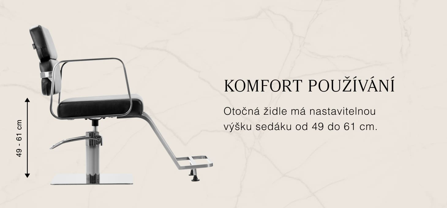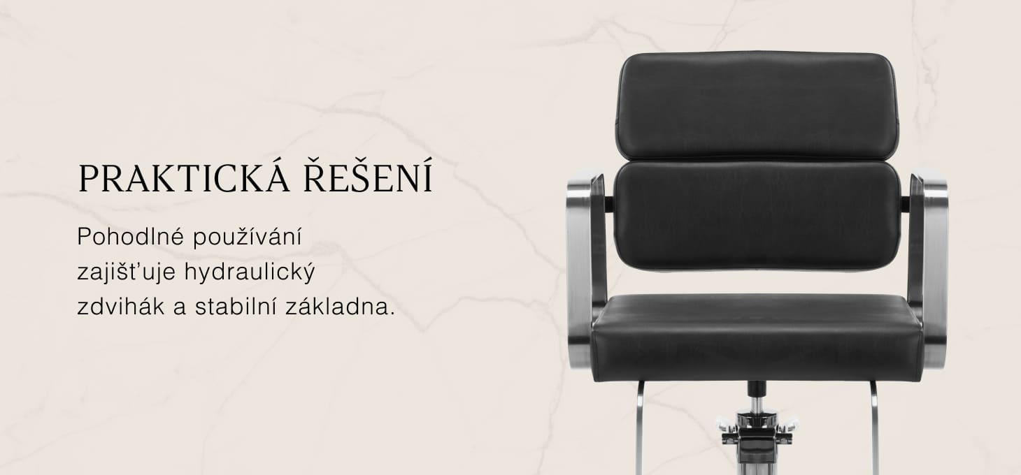 Odolný hydraulický zvedák umožňuje nastavit výšku sedadla v rozmezí 49-61 cm - a to i v případě, že klient na židli sedí. Poskytuje ergonomičtější pracovní prostředí, protože umožňuje nastavit úroveň sedadla podle výšky klienta i kadeřníka. Vizuálně zajímavé opěradlo umožňuje pohodlnou polohu a poskytuje vynikající oporu zad, což je důležité zejména při několikahodinových ošetřeních. Velkým plusem tohoto modelu je otvor ponechaný mezi opěradlem a sedákem. Usnadňuje udržování čistoty v salonu, protože umožňuje snadné vymetení vlasů ze všech koutů křesla. To usnadňuje přípravu pracoviště mezi jednotlivými klienty.