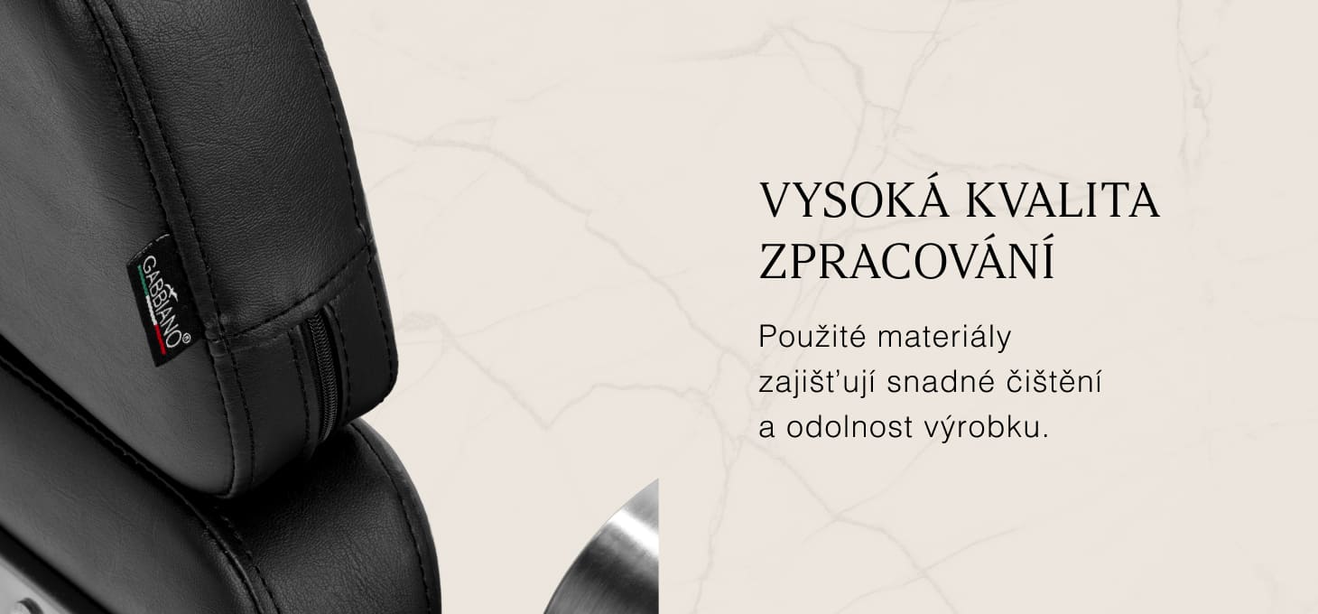 Polstrování z odolné pěny odolné proti deformacím a čalounění z na dotek příjemné syntetické kůže zajišťují odolnost nábytku a jeho pohodlné používání po dlouhou dobu. Díky nim je také odolný proti vlhkosti, trvanlivý a snadno se čistí. Potah v odstínech černé barvy mu dodává jedinečný charakter. Zařízení se vyznačuje moderním designem, díky němuž se křeslo skvěle vyjímá v mnoha profesionálních salonech.