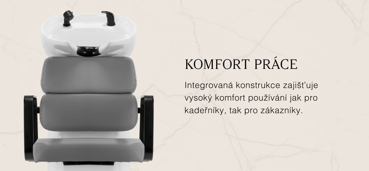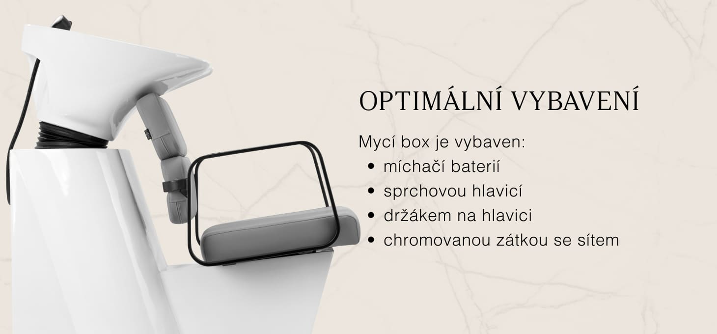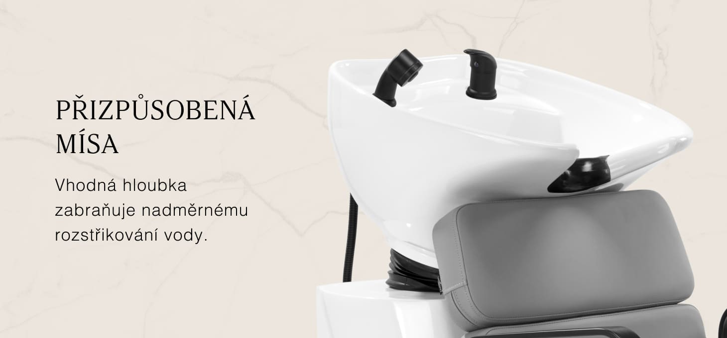 Praktická myčka vlasů je vybavena směšovací baterií, která poskytuje volný přístup k teplé a studené vodě. Díky tomu lze snadno nastavit teplotu podle individuálních preferencí zákazníka. Vyhrazené místo pro odložení sluchátka zefektivňuje práci a chromovaná zátka se speciálním sítkem umožňuje kontrolovat průtok vody a udržovat v salonu vysoké hygienické standardy. Přípojka vody byla umístěna uvnitř základny, což umožňuje efektivní skrytí potrubí. Významnou výhodou tohoto modelu je otvor ponechaný mezi opěradlem a sedákem, který usnadňuje udržování čistoty v salonu a umožňuje snadné vymetení nečistot z každého zákoutí křesla. Myčka je profilována tak, aby zajistila pohodlí při různých ošetřeních a zaručila správnou oporu zad. Díky kombinaci funkčnosti a vybavení je práce v kadeřnickém salonu ještě pohodlnější.