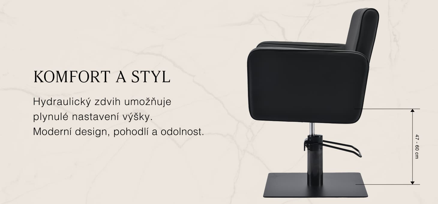 Odolný hydraulický zvedák umožňuje plynulé nastavení výšky sedadla v rozmezí 47 až 60 cm - i když klient sedí v křesle. Práce je tak ergonomičtější a polohu lze snadno nastavit tak, aby vyhovovala výšce klienta i kadeřníka. Pohodlné opěradlo poskytuje stabilní oporu zad a usnadňuje pohodlnou polohu, což je důležité zejména při dlouhých ošetřeních, a zvyšuje tak pohodlí a spokojenost klienta.