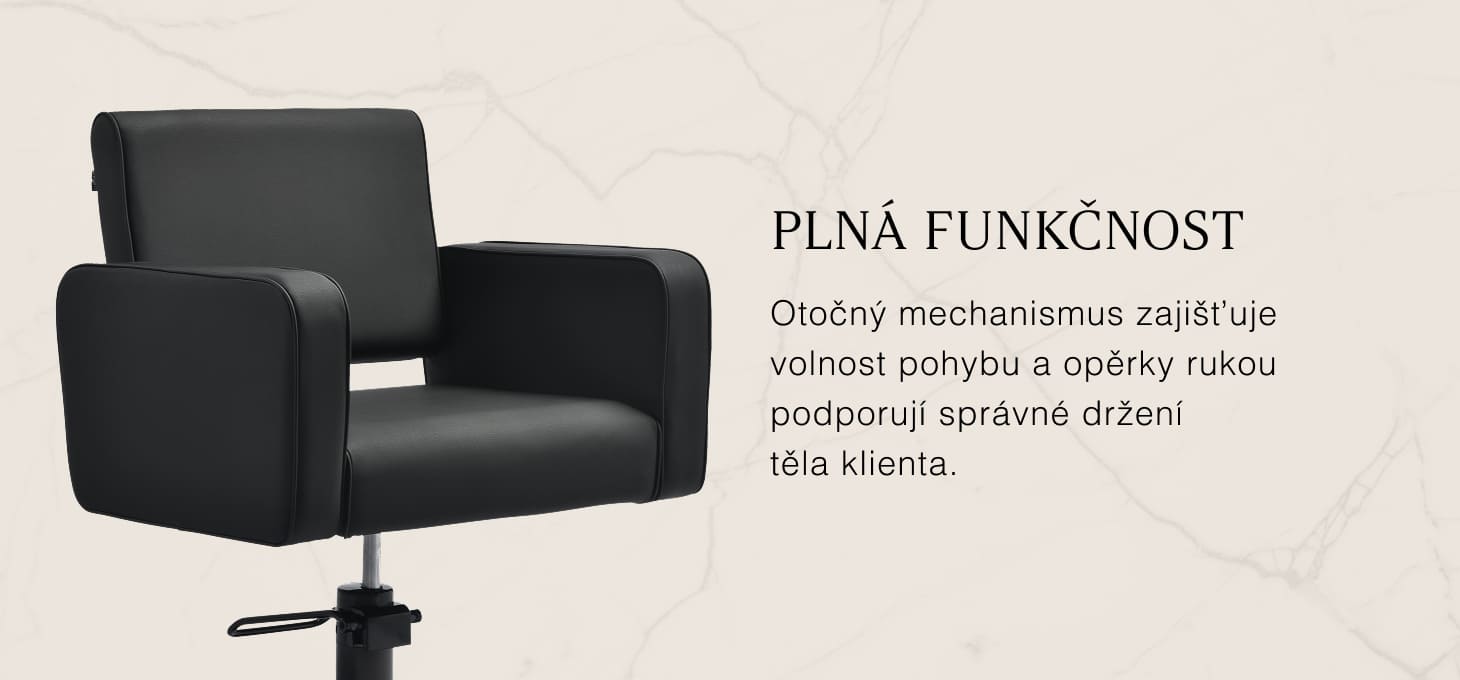 Sedadlo zaručuje pohodlí i při dlouhých ošetřeních. Ergonomické područky podporují správné držení těla klienta, zajišťují pohodlí a usnadňují přesné střihy a styling. Plně otočný mechanismus zajišťuje větší mobilitu a volnost pohybu, díky čemuž je práce kadeřníka plynulejší, efektivnější a méně stresující. Další vymožeností je praktický otvor mezi opěradlem a sedákem, který usnadňuje čištění a rychlé odstraňování chloupků z těžko přístupných míst. To umožňuje efektivní a hygienickou přípravu stanoviště pro dalšího klienta.