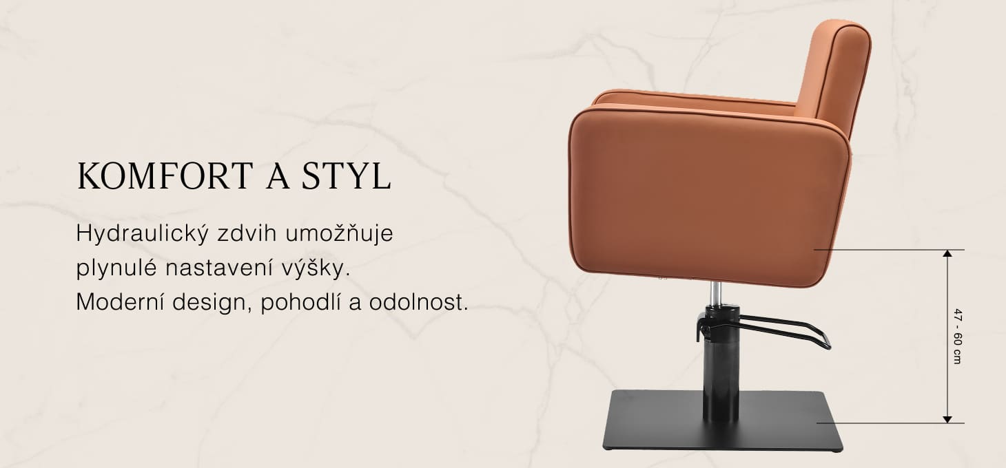 Odolný hydraulický zvedák umožňuje plynulé nastavení výšky sedadla v rozmezí 47 až 60 cm - i když klient sedí v křesle. Práce je tak ergonomičtější a polohu lze snadno nastavit tak, aby vyhovovala výšce klienta i kadeřníka. Pohodlné opěradlo poskytuje stabilní oporu zad a usnadňuje pohodlnou polohu, což je důležité zejména při dlouhých ošetřeních, a zvyšuje tak pohodlí a spokojenost klienta.