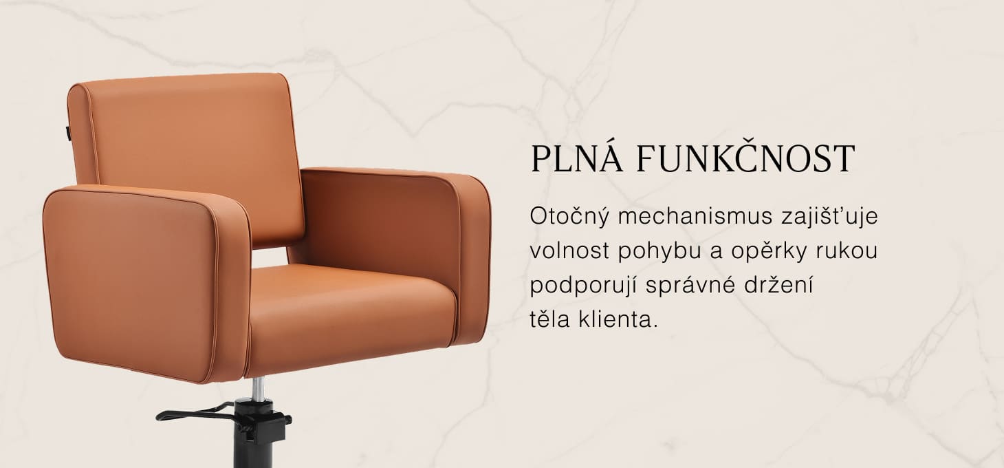 Sedadlo zaručuje pohodlí i při dlouhých ošetřeních. Ergonomické područky podporují správné držení těla klienta, zajišťují pohodlí a usnadňují přesné střihy a styling. Plně otočný mechanismus zajišťuje větší mobilitu a volnost pohybu, díky čemuž je práce kadeřníka plynulejší, efektivnější a méně stresující. Další vymožeností je praktický otvor mezi opěradlem a sedákem, který usnadňuje čištění a rychlé odstraňování chloupků z těžko přístupných míst. To umožňuje efektivní a hygienickou přípravu stanoviště pro dalšího klienta.