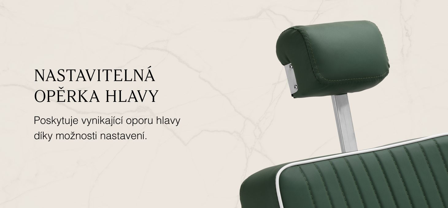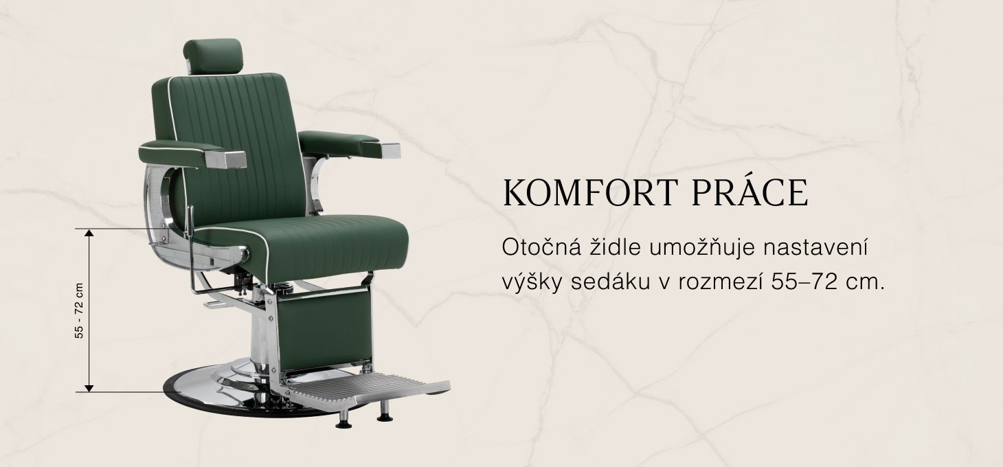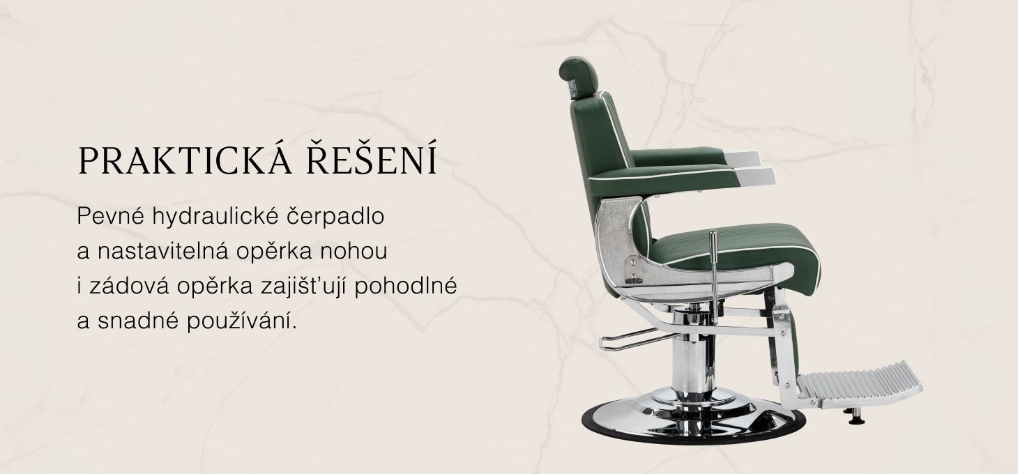 Robustní konstrukce základny zajišťuje stabilitu a vysoký komfort. Sedák je vyplněn pěnou odolnou proti deformaci a čalouněn měkkou matnou syntetickou kůží, která kombinuje odolnost s pohodlím. Materiály použité na povrchovou úpravu jsou odolné proti vlhkosti, trvanlivé a snadno se čistí, takže židle je ideální pro každodenní používání. Stylové prošívání a čalounění v odstínech zelené barvy mu dodávají jedinečný charakter, který dokonale ladí s interiérem moderních holičství.