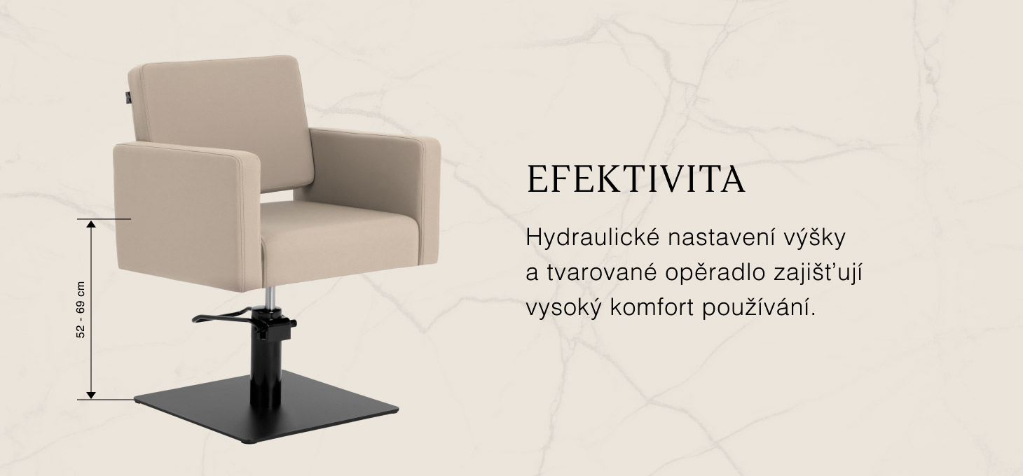 Odolný hydraulický zvedák umožňuje plynulou regulaci výšky sedadla v rozmezí 52–69 cm, a to i během používání křesla. Toto řešení podporuje ergonomii práce a umožňuje snadné přizpůsobení polohy jak výšce zákazníka, tak kadeřníka. Profilované opěradlo zajišťuje stabilní oporu zad a pohodlnou polohu, což je zvláště důležité při delších procedurách, protože reálně zvyšuje pohodlí a spokojenost zákazníka.