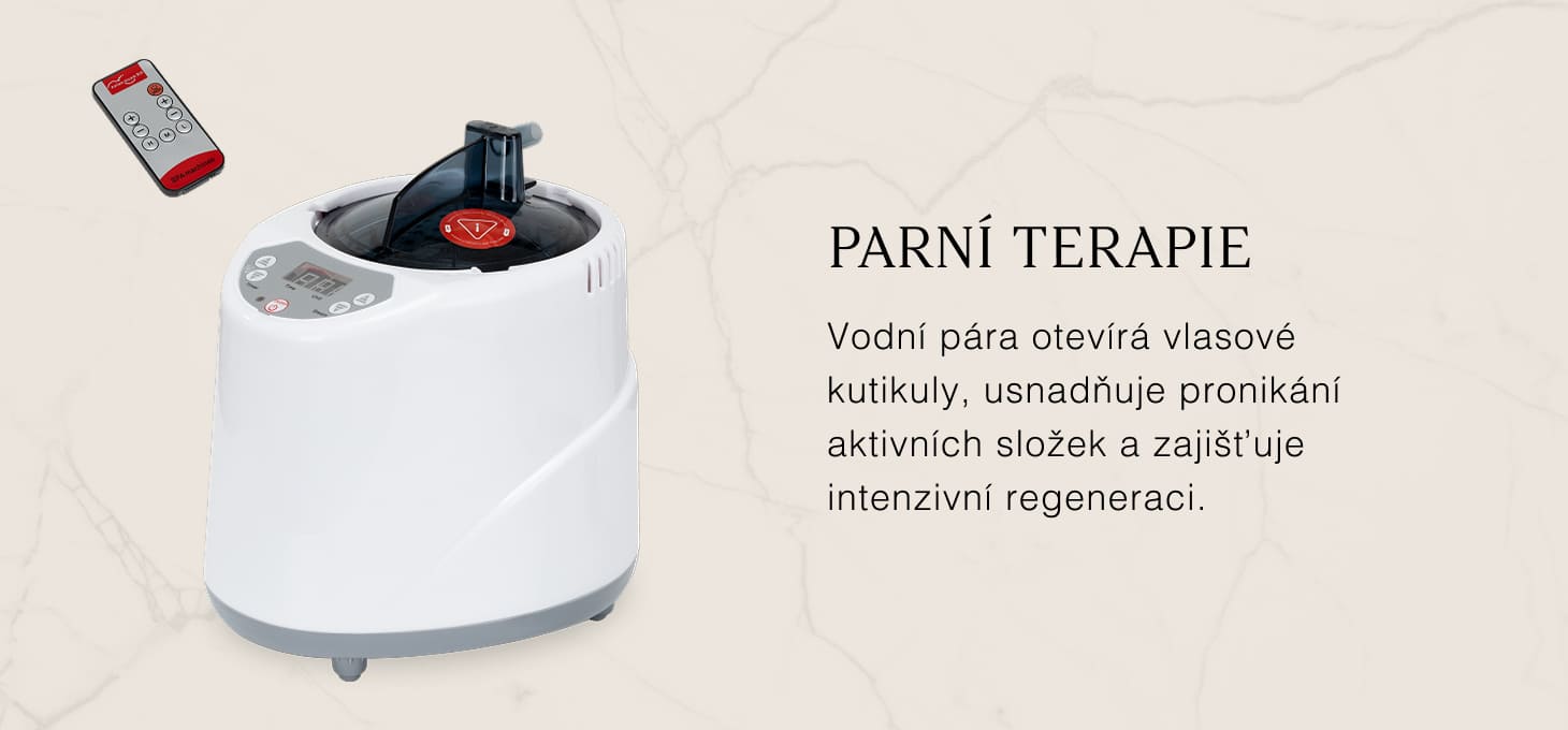 Tato revoluční metoda péče o vlasy využívá vlastností páry k regeneraci a hydrataci vlasů. Sada obsahuje specializovaný parní generátor a speciální kryt umyvadla, který umožňuje přesnou regulaci páry. Díky tomu se účinné látky v maskách, ampulích a dalších přípravcích pro péči o vlasy účinněji vstřebávají a podporují obnovu a posílení vlasů. Parní terapie zlepšuje strukturu vlasů, zvyšuje jejich odolnost proti poškození a obnovuje zdravý lesk, takže jsou jemnější, pružnější a plné života.