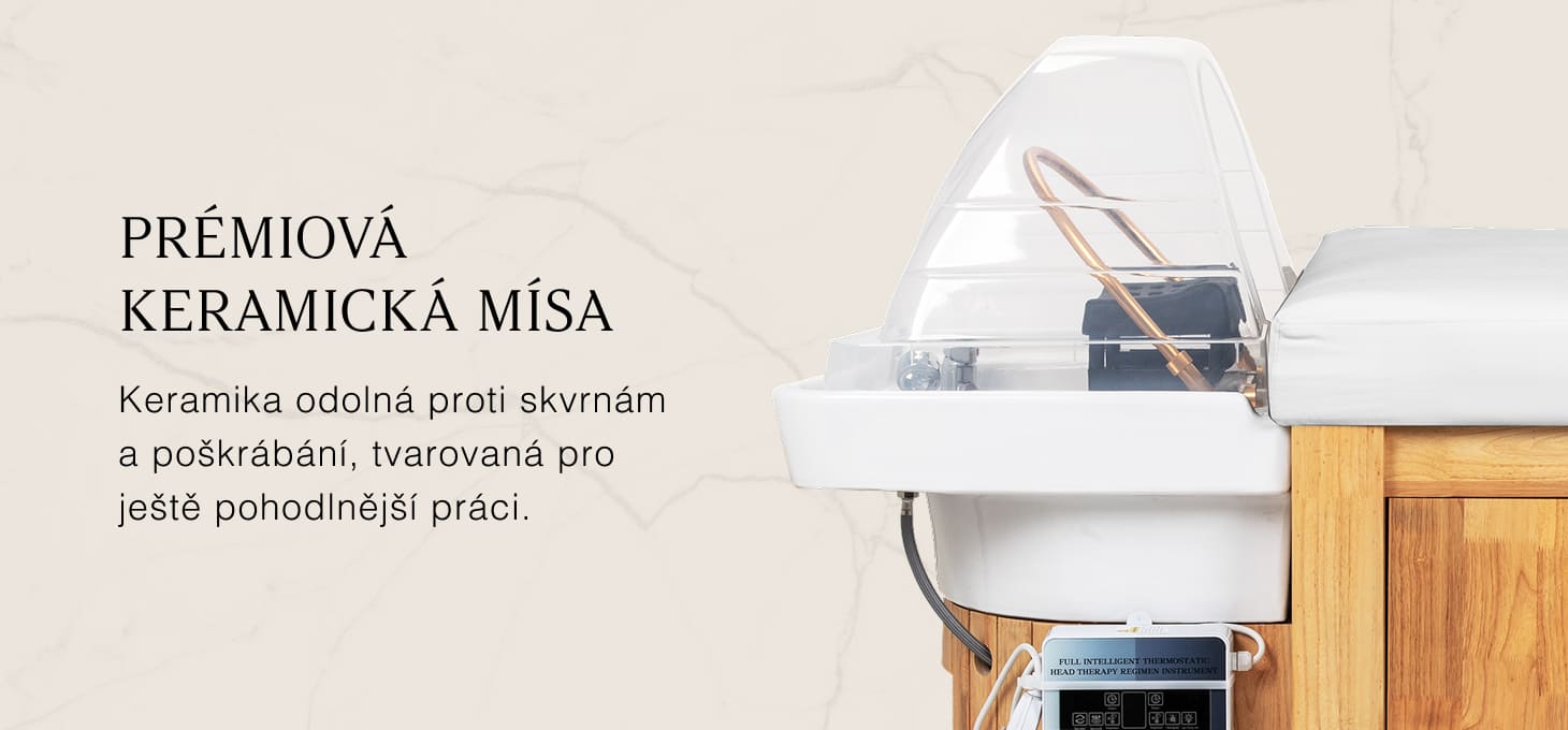 Hluboká keramická mísa v odstínech bílé barvy účinně omezuje rozstřikování vody a produktů používaných při ošetření, čímž zajišťuje čistotu a pohodlí při práci. Miska je vyrobena z odolného materiálu, je odolná proti změně barvy, poškrábání a poškození a její hladký povrch mimořádně usnadňuje čištění. Její výrazný profil nejen usnadňuje přístup osobě provádějící úkony, ale také dodává mycí jednotce elegantní a moderní vzhled. Kombinace estetiky a funkčnosti zvyšuje úroveň každého profesionálního prostoru.