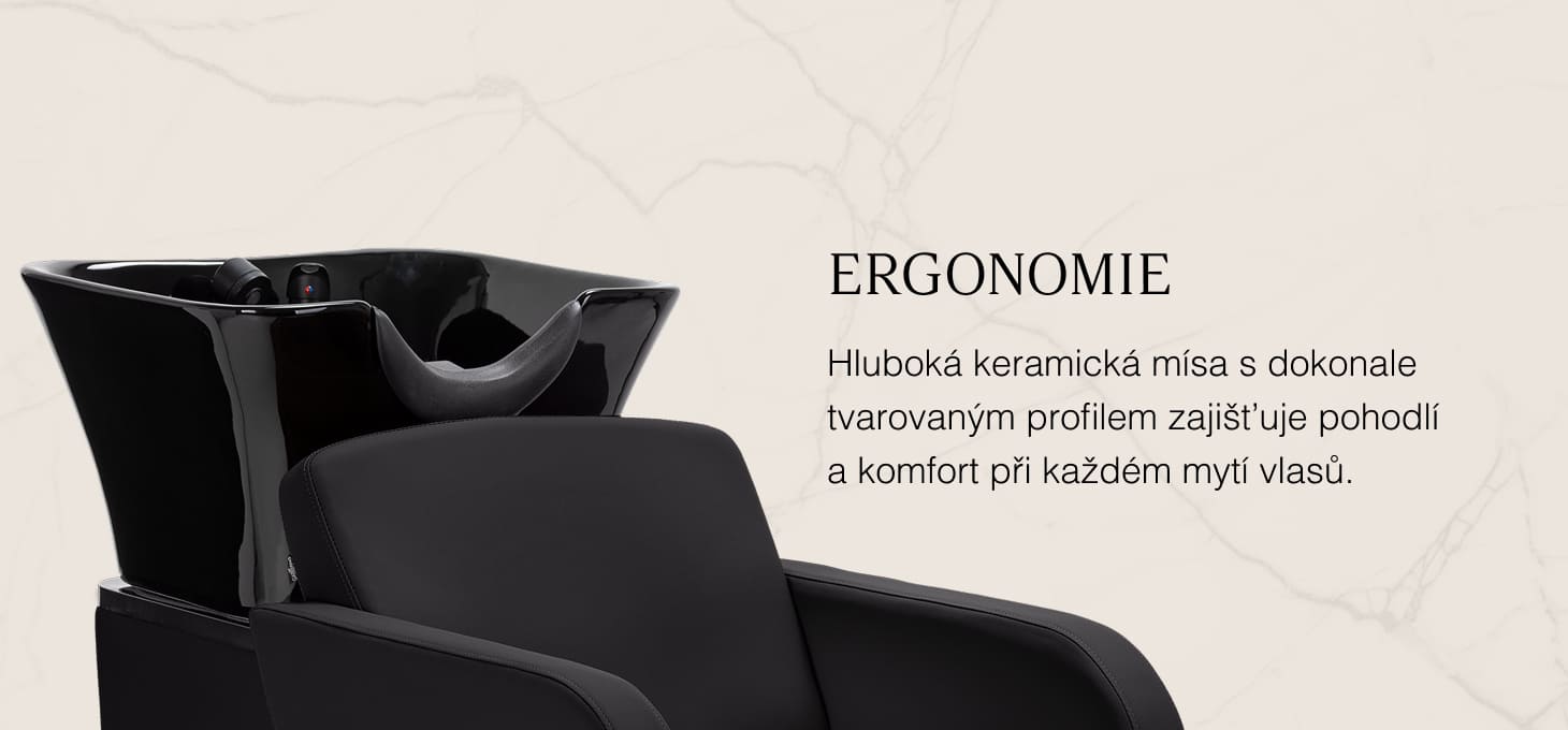 The ceramic bowl in shades of black, with its modern shape and appropriate depth, effectively prevents splashing of water and products used during treatments, allowing for comfortable and effective performance of a wide range of services. The properly profiled collar and angled backrest provide comfort and support during hair washing, while the black plastic cover protects the client from the cold ceramic surface, ensuring a pleasant experience during the treatment.