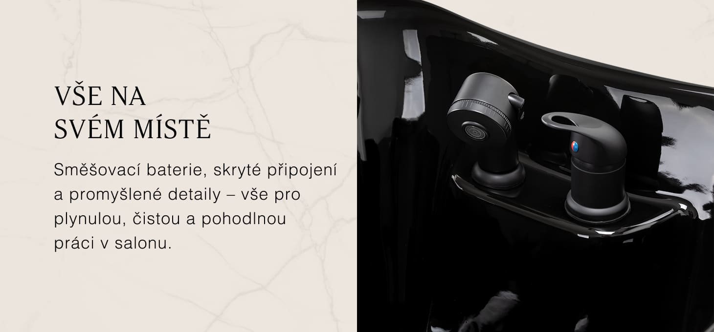 The wash unit is equipped with a mixer tap that allows easy access to hot and cold water, allowing for precise temperature adjustment to the client's individual preferences. A practical place to hang up the handset makes work easier, while a plug with a special strainer allows you to control the water flow and maintain high hygiene standards in the salon. The water connection is located inside the base, ensuring the installation remains discreetly hidden, which improves the aesthetics and tidiness of the workstation. The wash unit's ergonomic shape ensures comfort during a variety of treatments, and the thoughtful combination of functionality and details makes everyday work in the salon even more convenient.