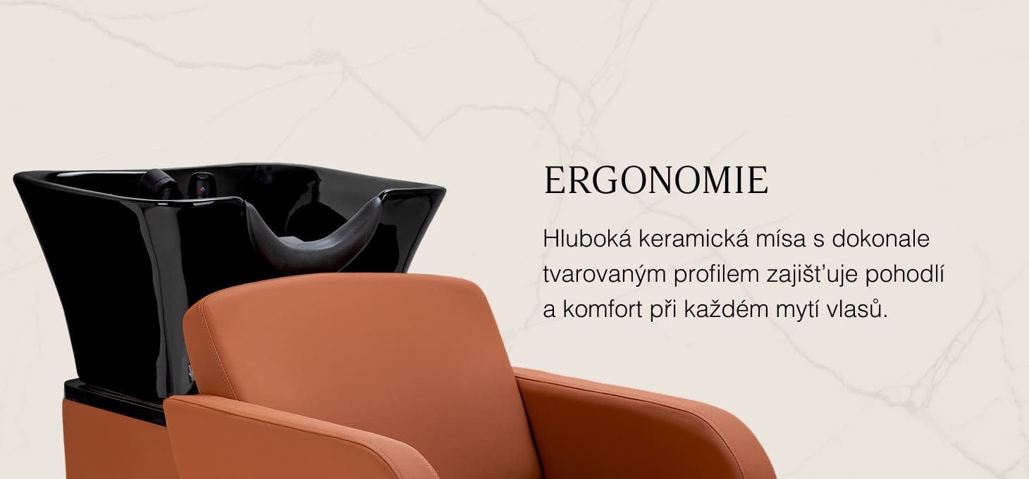 The ceramic bowl in shades of black, with its modern shape and appropriate depth, effectively prevents splashing of water and products used during treatments, allowing for comfortable and effective performance of a wide range of services. The properly profiled collar and angled backrest provide comfort and support during hair washing, while the black plastic cover protects the client from the cold ceramic surface, ensuring a pleasant experience during the treatment.