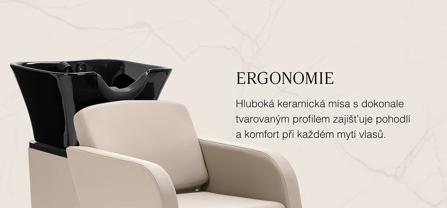 The ceramic bowl in shades of black, with its modern shape and appropriate depth, effectively prevents splashing of water and products used during treatments, allowing for comfortable and effective performance of a wide range of services. The properly profiled collar and angled backrest provide comfort and support during hair washing, while the black plastic cover protects the client from the cold ceramic surface, ensuring a pleasant experience during the treatment.