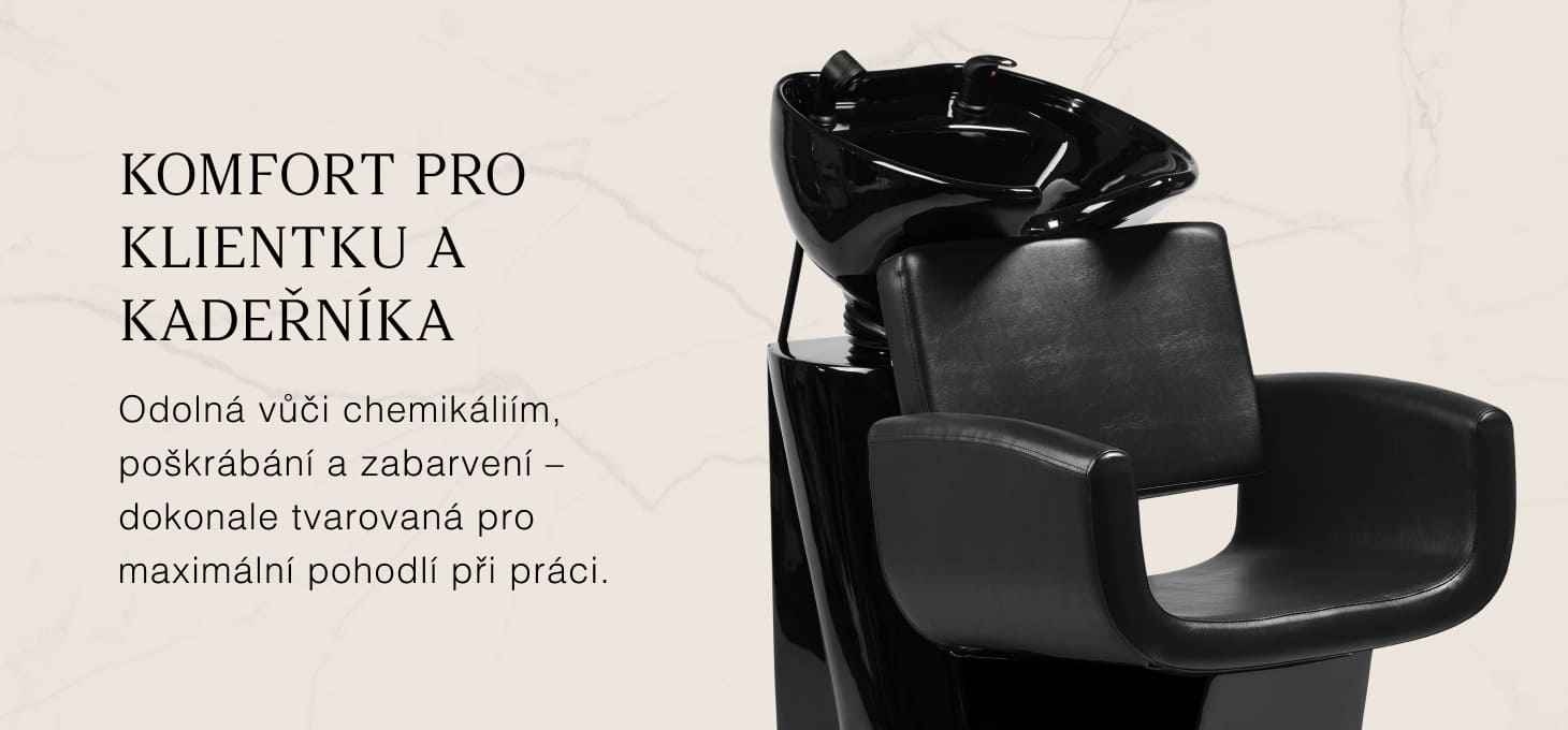 Hluboká keramická mísa v odstínech černé barvy snižuje rozstřikování vody a kosmetických přípravků používaných při ošetření. Nastavitelný úhel sklonu umožňuje přizpůsobení individuálním potřebám. Odolný materiál je odolný vůči skvrnám, poškrábání a chemikáliím a hladký povrch usnadňuje čištění. Ergonomicky tvarovaný límec poskytuje pohodlnou oporu hlavy.