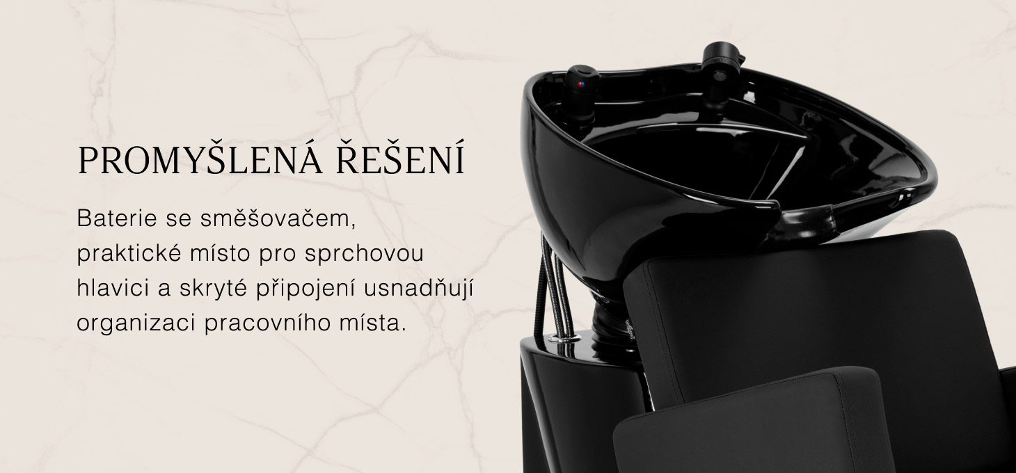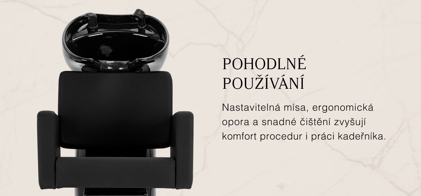 Hluboká keramická miska v odstínech černé barvy minimalizuje rozstřikování vody a kosmetických přípravků během procedur. Nastavitelný úhel sklonu mísy umožňuje přesné přizpůsobení její polohy potřebám zákazníka. Je vyrobena z odolného materiálu, je odolná proti zabarvení, poškrábání a působení chemikálií a její hladký povrch usnadňuje udržování čistoty. Ergonomicky tvarovaný límec zajišťuje pohodlnou oporu hlavy a černá plastová krytka eliminuje pocit chladu při kontaktu s keramikou.