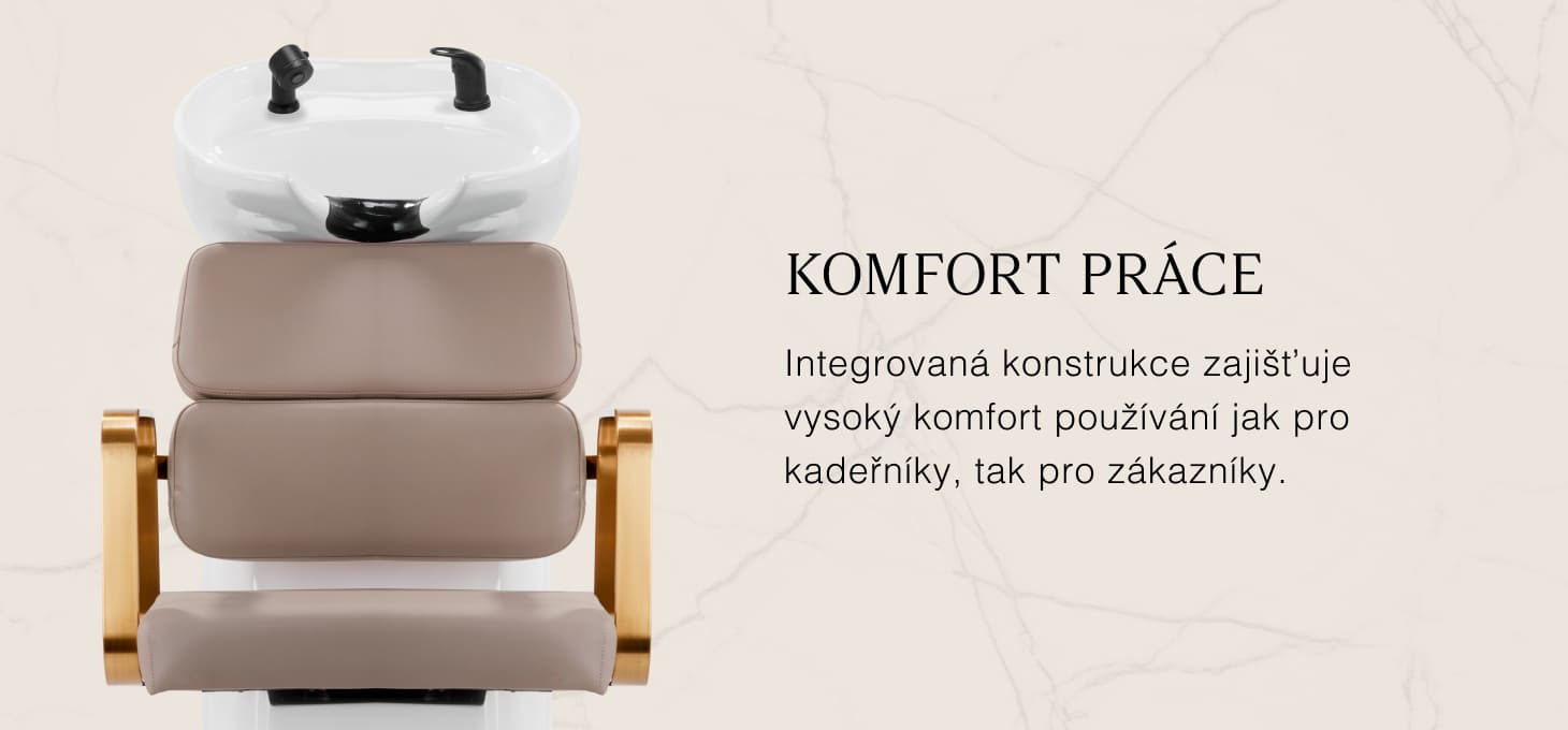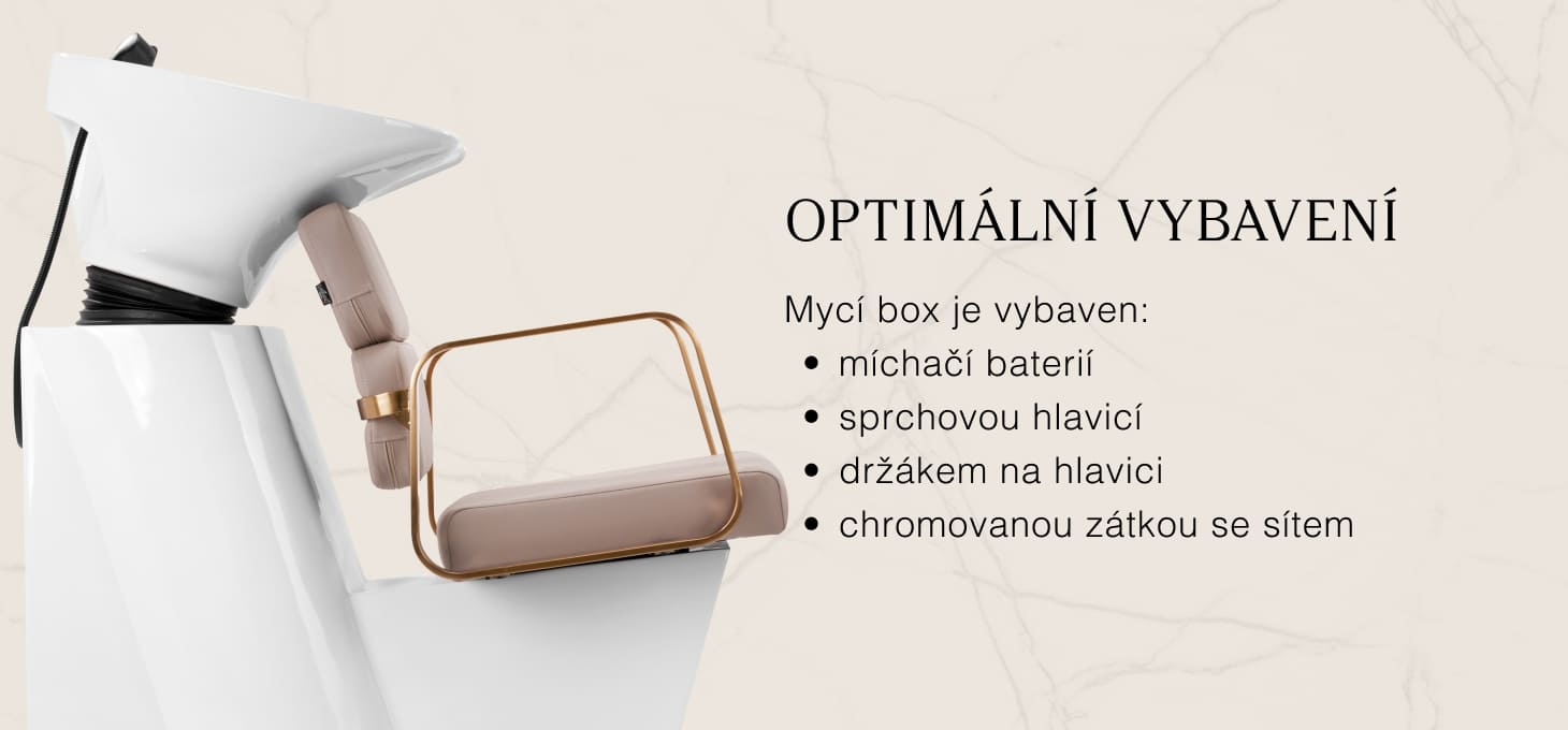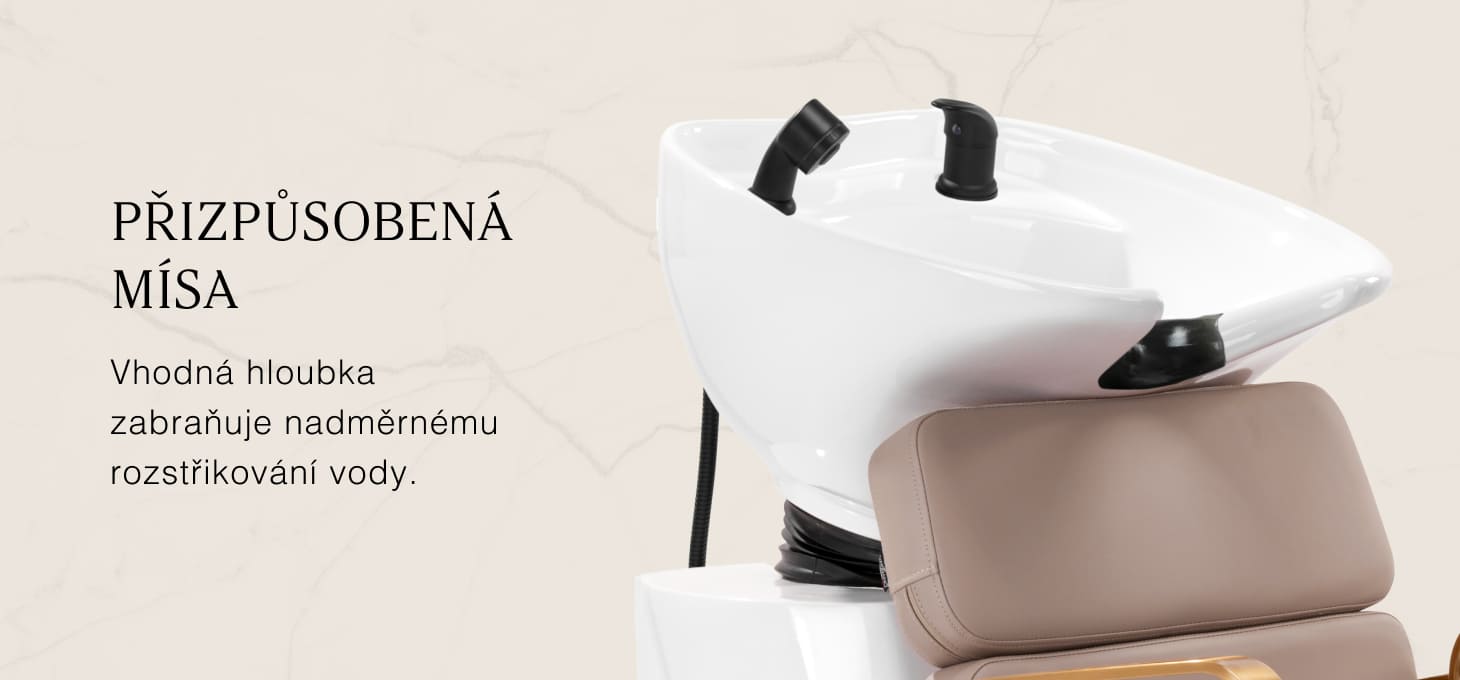 Praktická myčka vlasů je vybavena směšovací baterií, která poskytuje volný přístup k teplé a studené vodě. Díky tomu lze snadno přizpůsobit teplotu individuálním preferencím zákazníka. Vyhrazené místo pro odložení sluchátka zefektivňuje práci a chromovaná zátka se speciálním sítkem umožňuje kontrolovat průtok vody a udržovat v salonu vysoké hygienické standardy. Přípojka vody byla umístěna uvnitř základny, což umožňuje efektivní skrytí potrubí. Významnou výhodou tohoto modelu je otvor ponechaný mezi opěradlem a sedákem, který usnadňuje udržování čistoty v salonu a umožňuje snadné vymetení nečistot z každého zákoutí křesla. Myčka je profilována tak, aby zajistila pohodlí při různých ošetřeních a zaručila správnou oporu zad. Díky kombinaci funkčnosti a vybavení je práce v kadeřnickém salonu ještě pohodlnější.