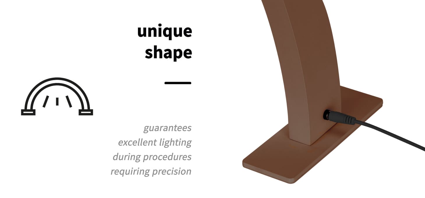 Charakteristický tvar hlavy lampy je zajímavým designem, který zároveň zaručuje vysokou funkčnost. Široký, specificky zakřivený profil vyplněný 582 LED diodami zajišťuje osvětlení ošetřované oblasti bez stínů, což zaručuje vysoký komfort během služeb. Je také ideální pro pořizování fotografií účinků, které jasně exponuje. Mléčný, poloprůhledný povrch panelu dobře rozptyluje světlo, takže lampa neoslňuje oči. Správné parametry a možnost nastavení intenzity světla zajišťují vynikající reprodukci viděných barev, a tak lampa neunavuje oči ani při dlouhodobé práci.