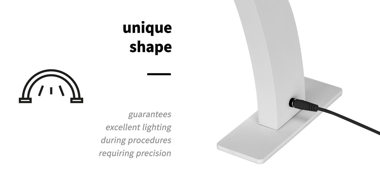 Charakteristický tvar hlavy lampy je zajímavým designem, který zároveň zaručuje vysokou funkčnost. Široký, specificky zakřivený profil vyplněný 582 LED diodami zajišťuje osvětlení ošetřované oblasti bez stínů, což zaručuje vysoký komfort během služeb. Je také ideální pro pořizování fotografií účinků, které jasně exponuje. Mléčný, poloprůhledný povrch panelu dobře rozptyluje světlo, takže lampa neoslňuje oči. Správné parametry a možnost nastavení intenzity světla zajišťují vynikající reprodukci viděných barev, a tak lampa neunavuje oči ani při dlouhodobé práci.