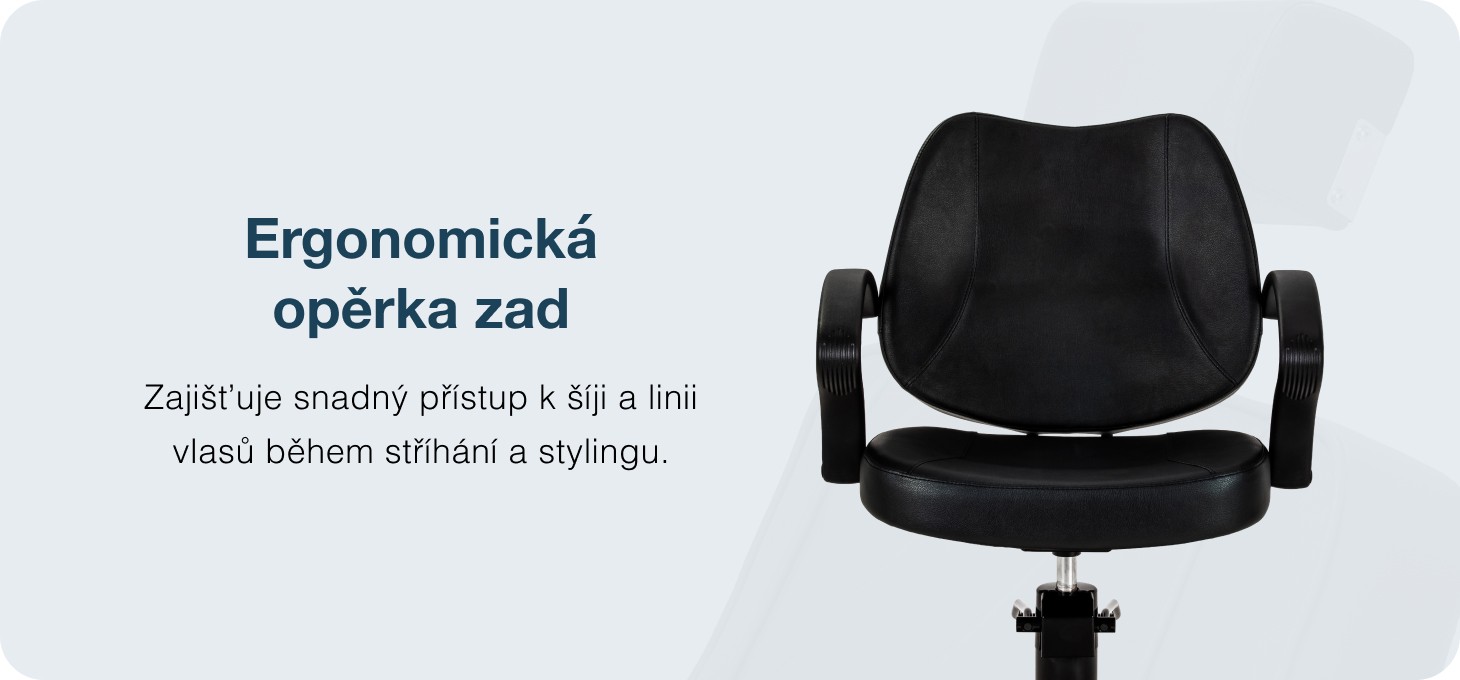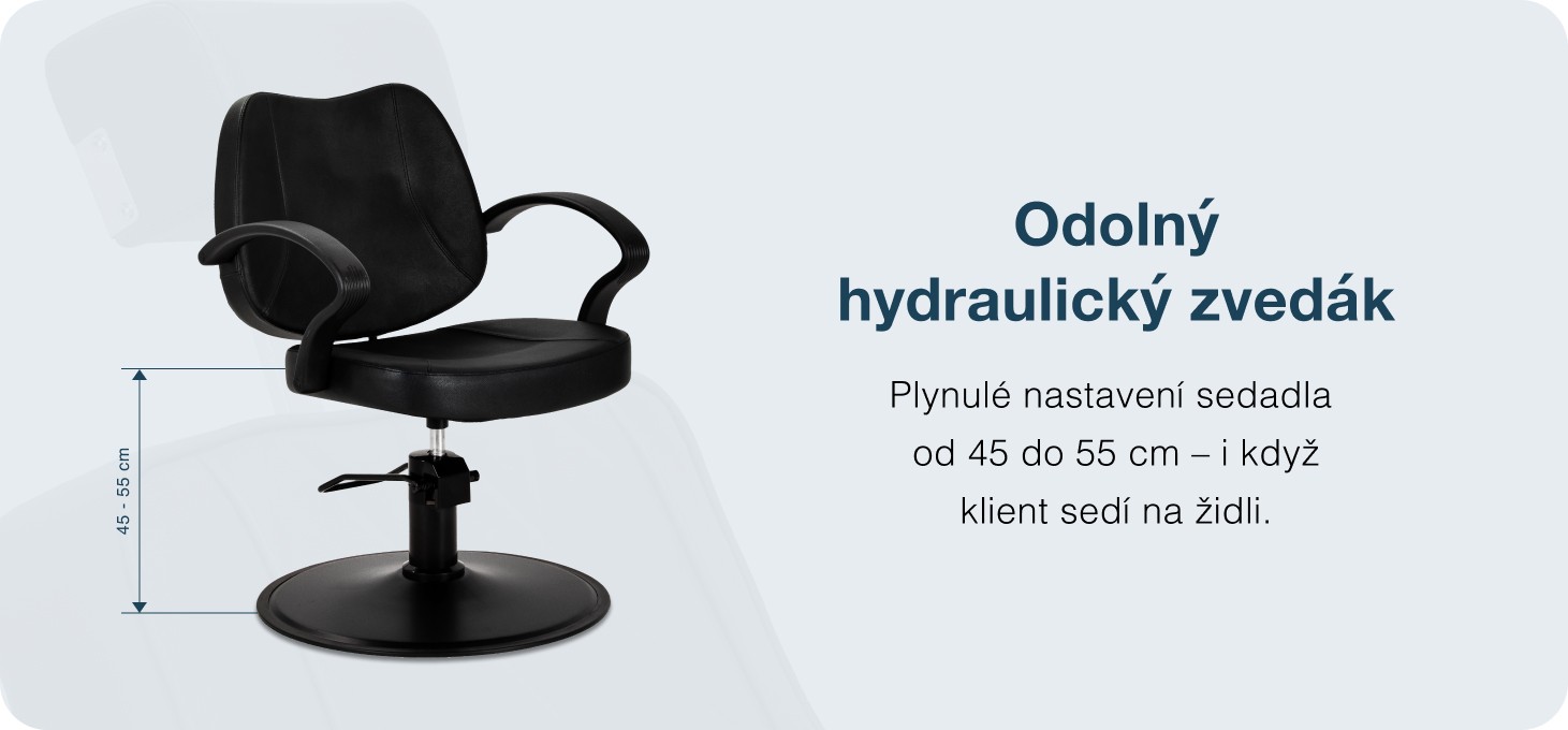 Odolný hydraulický zvedák umožňuje nastavení výšky sedadla v rozmezí 45 až 55 cm - i když klient sedí. To usnadňuje ergonomickou práci a umožňuje kadeřníkovi přizpůsobit výšku svým potřebám a výšce zákazníka. Opěradlo poskytuje vynikající oporu zad, což je užitečné zejména při dlouhých ošetřeních. Ergonomicky profilovaný tvar a zaoblená horní hrana opěradla usnadňují přístup ke krku, zátylku a linii vlasů, což podporuje přesné stříhání, styling a barvení.