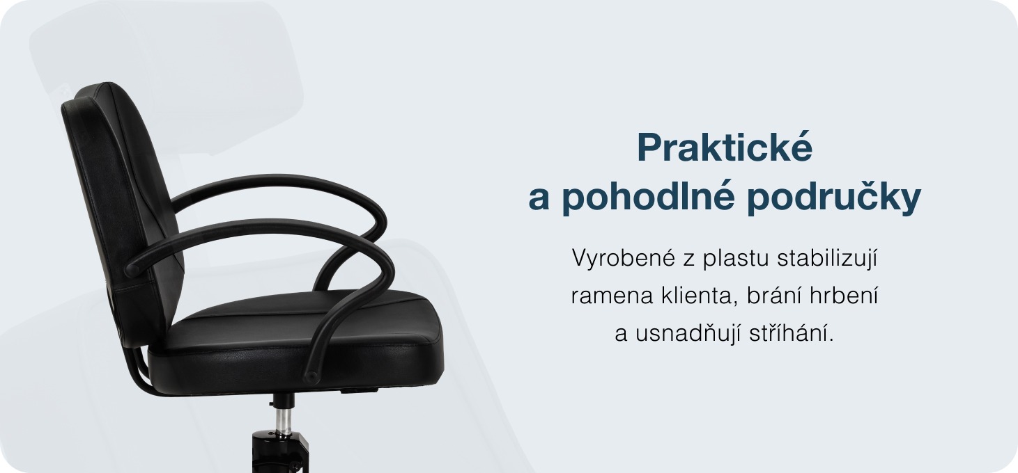 Křeslo je vybaveno plně otočným mechanismem, který poskytuje volnost pohybu a zefektivňuje práci kadeřníků. Plastové područky ve správné výšce umožňují správnou polohu ramen klienta, čímž zabraňují nesprávnému držení těla včetně hrbení a výrazně usnadňují přesné ošetření. Robustní povrchová úprava područek navíc zvyšuje odolnost křesla a jejich ergonomický design zvyšuje pohodlí při kratších i delších službách.