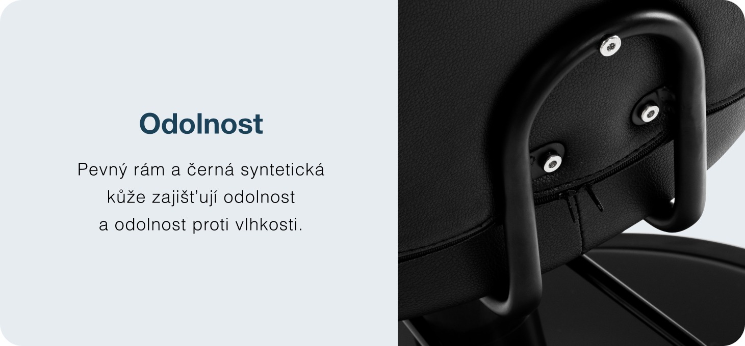 Odolný korpus a syntetická kůže v odstínech černé zajišťují odolnost proti vlhkosti, pevnost a trvanlivost. Kulatá základna v odstínech černé zaručuje stabilitu a odolnost. Zeštíhlené horní opěradlo dodává židli vizuální lehkost a podtrhuje její moderní charakter, zatímco pečlivě propracované detaily dokládají vysokou kvalitu řemeslného zpracování. Díky minimalistické černé barvě v kombinaci s estetickým prošíváním se židle bez problémů začlení do různých stylů interiéru salonu a dodá mu elegantní a moderní nádech.