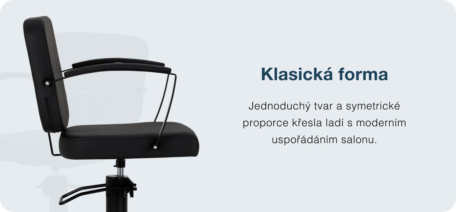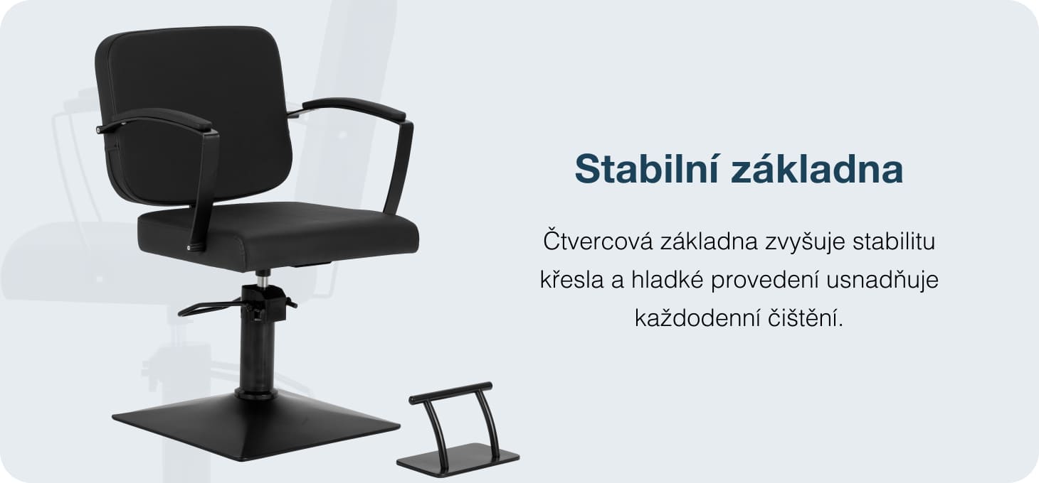Pevná čtvercová základna křesla zajišťuje stabilitu a jeho hladký povrch se snadno udržuje v čistotě. Estetické, ergonomicky tvarované čalouněné područky jsou umístěny v optimální výšce, což klientovi umožňuje zaujmout přirozenou, správnou polohu. To zvyšuje pohodlí a podporuje uvolněné držení těla, což se projevuje v hladším průběhu ošetření a umožňuje kadeřníkovi precizní práci v každé fázi služby.