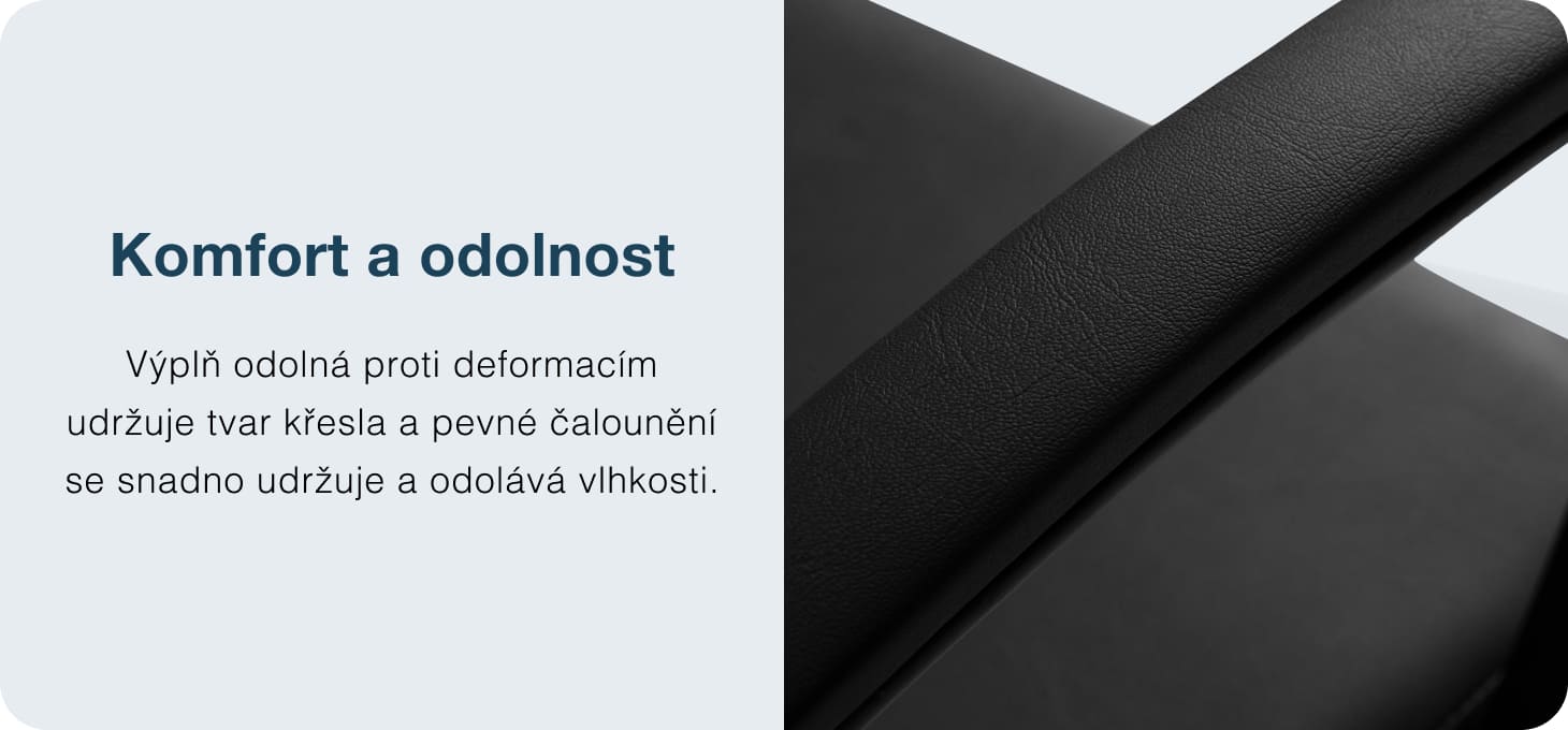 Sedadlo je vyplněno odolnou pěnou, která je odolná proti deformaci, takže křeslo zůstává tvarově stálé a plně funkční po dlouhou dobu. Čalounění z imitace kůže příjemné na dotek se vyznačuje odolností vůči vlhkosti, vysokou trvanlivostí a snadným čištěním. Sytě černá barva čalounění mu dodává nadčasovou eleganci. Díky klasickému provedení vypadá křeslo skvěle téměř v každém prostoru a podtrhuje styl obývacího pokoje.