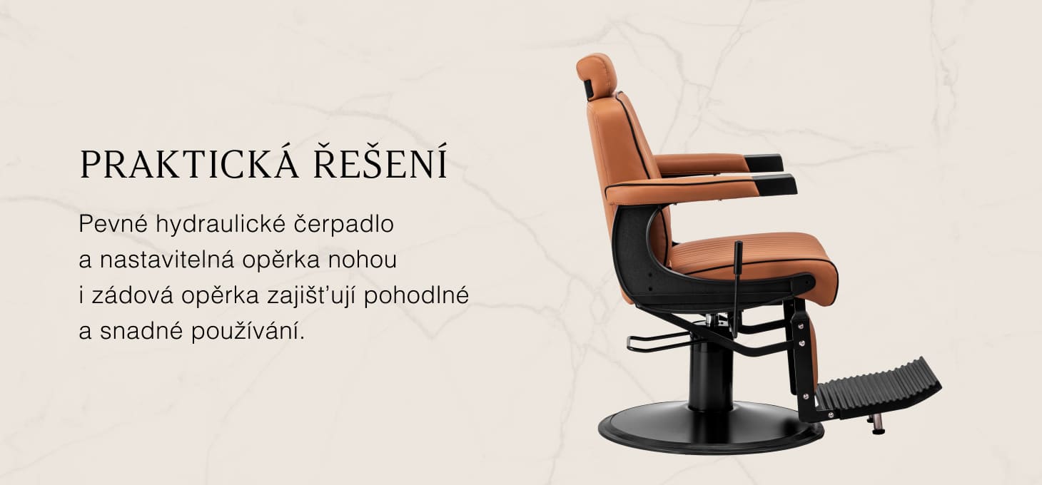 Robustní konstrukce základny zajišťuje stabilitu a vysoký komfort. Sedák je vyplněn pěnou odolnou proti deformaci a čalouněn měkkou matnou syntetickou kůží, která kombinuje odolnost s pohodlím. Materiály použité na povrchovou úpravu jsou odolné proti vlhkosti, trvanlivé a snadno se čistí, takže židle je ideální pro každodenní používání. Stylové prošívání a čalounění v odstínech hnědé barvy mu dodávají jedinečný charakter, který dokonale ladí s interiérem moderních holičství.