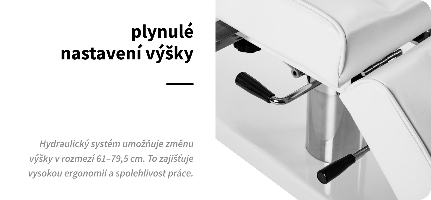 Výkonný hydraulický zvedák umožňuje plynulé nastavení výšky sedáku v rozmezí 61–79,5 cm bez použití rukou. To usnadňuje přizpůsobení výšky křesla výšce odborníka a charakteru prováděného zákroku, čímž podporuje ergonomickou a pohodlnou pracovní polohu. Použitý mechanismus se vyznačuje odolností a spolehlivostí při každodenním používání.
