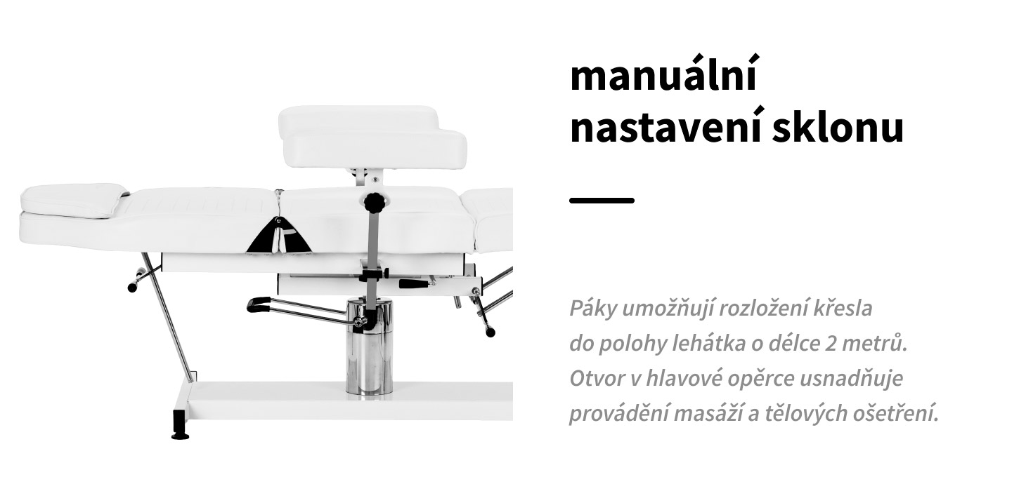 Speciální páčky umožňují nastavení sklonu opěradla a podnožky, což umožňuje přesné přizpůsobení nastavení individuálním potřebám. Křeslo lze sklopit až do polohy lehátka, což výrazně zvyšuje jeho funkčnost při ošetření obličeje a těla. Otvor v opěrce hlavy, skrytý pod tvarovaným polštářem, zajišťuje, že se model skvěle hodí také pro procedury prováděné na zádech, jako jsou masáže. Po úplném rozložení činí délka křesla přibližně 2 metry, což zajišťuje stabilní oporu celého těla a vysoký komfort jak pro klienta, tak pro odborníka.