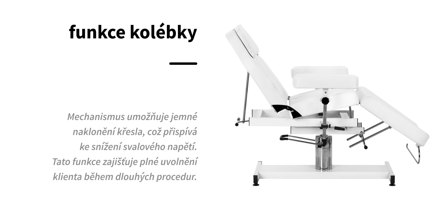 Použitý houpací mechanismus umožňuje jemné naklánění křesla, což zvyšuje pohodlí klienta a napomáhá uvolnění těla během procedur. Tato funkce podporuje přirozené držení těla, pomáhá snižovat svalové napětí a zajišťuje příjemný pocit uvolnění, zejména při delších kosmetických procedurách nebo masážích. Houpací mechanismus také umožňuje lepší přizpůsobení polohy specifikům prováděného ošetření, čímž zvyšuje pohodlí jak klienta, tak odborníka.