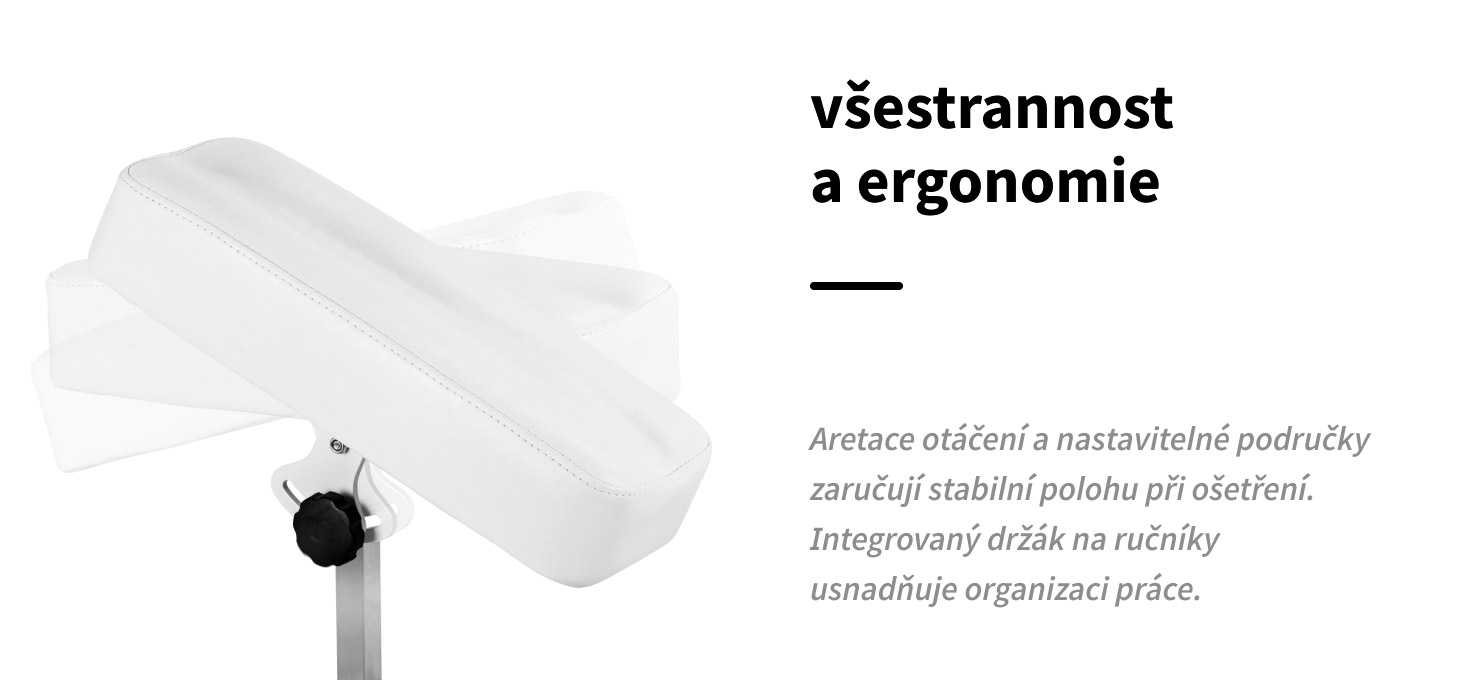 Mechanismus plného otočení usnadňuje přizpůsobení polohy křesla aktuálně prováděnému zákroku. Pohon vybavený blokovacím systémem stabilně udržuje zvolenou polohu a zajišťuje bezpečnost a jistotu používání během celého zákroku. Područky zaručují správnou oporu rukou, podporují přirozené držení těla a pohodlí klienta, a v případě potřeby je lze snadno demontovat, čímž se získá lepší přístup k pracovnímu místu. Možnost nastavení jejich výšky a úhlu sklonu umožňuje přesně přizpůsobit nastavení typu procedury a individuálním preferencím uživatele. Dalším vylepšením je praktický držák na ručníky v roli, který usnadňuje organizaci práce.