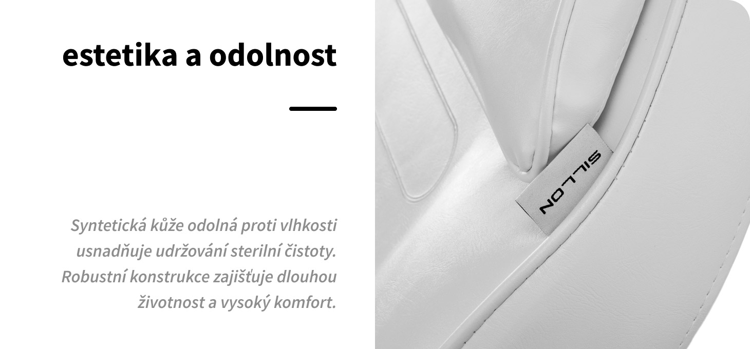 Křeslo je vyplněno pěnou s odpovídající tvrdostí a potaženo syntetickou kůží v odstínech bílé. Materiál se vyznačuje odolností proti vlhkosti a snadnou údržbou, což přispívá k udržení vysoké úrovně hygieny. Profilované prošívání dodává sedáku ergonomický tvar a pevná konstrukce zajišťuje stabilitu a odolnost. Díky minimalistickému tvaru a světlým barvám se tento model harmonicky hodí jak do moderních, tak i do klasických interiérů kosmetických salonů a lázní.
