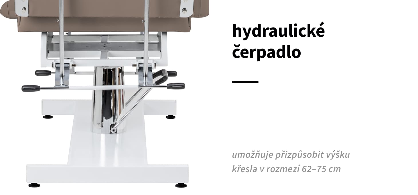 Výšku křesla lze nastavit v rozmezí 62-75 cm bez použití rukou pomocí hydraulického čerpadla. Díky tomu mohou zařízení pohodlně používat osoby s různou výškou a lze jej přizpůsobit individuálním potřebám klienta i lékaře. Použitý mechanismus je velmi odolný a spolehlivý. Díky otvoru v opěrce hlavy, který je skryt pod vhodně tvarovaným polštářem, je křeslo ideální také pro ošetření prováděná na zádech, jako jsou například masáže.