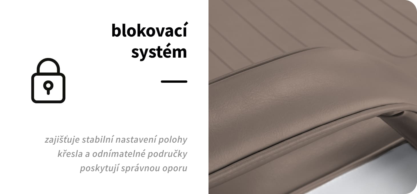 Křeslo se může plně otáčet, což umožňuje jeho přizpůsobení právě prováděnému ošetření. Pohon má zabudovaný systém aretace, takže po nastavení zvolené polohy ji zařízení stabilně drží. Područky zaručují dostatečnou oporu a v případě potřeby je lze snadno odejmout. Tyto prvky, rozdělené na poloviny, jsou pohyblivé, takže dobře leží při změně polohy opěradla.