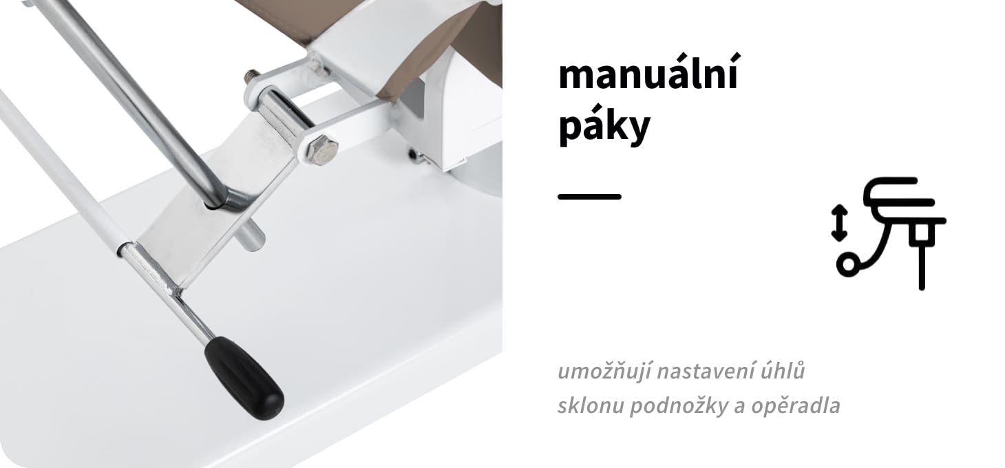 Pomocí speciálních páček je možné plynule nastavit úhly, v nichž jsou opěrka nohou a opěradlo umístěny. Díky tomu lze nastavení optimálně přizpůsobit individuálním potřebám a zajistit tak správné a pohodlné ošetření a pohodlí. Křeslo lze vysunout až do polohy lehátka, což výrazně zvyšuje jeho funkčnost při ošetření obličeje i těla.