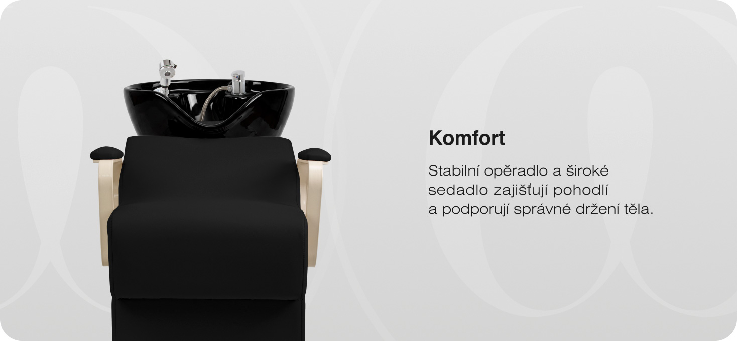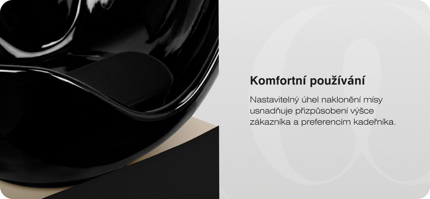 Hluboká, zaoblená keramická mísa v bílé barvě omezuje rozstřikování vody a kosmetických přípravků a pomáhá udržovat čistotu na pracovišti. Odolná keramika se vyznačuje vysokou odolností proti zabarvení, poškrábání a působení chemických látek. Tvarovaný límec zajišťuje stabilní oporu hlavy zákazníka a praktická opěrka v umyvadle umožňuje pohodlné uložení hlavy. Silikonová vložka omezuje pocit chladu a zvyšuje tak pohodlí zákazníka během procedur.