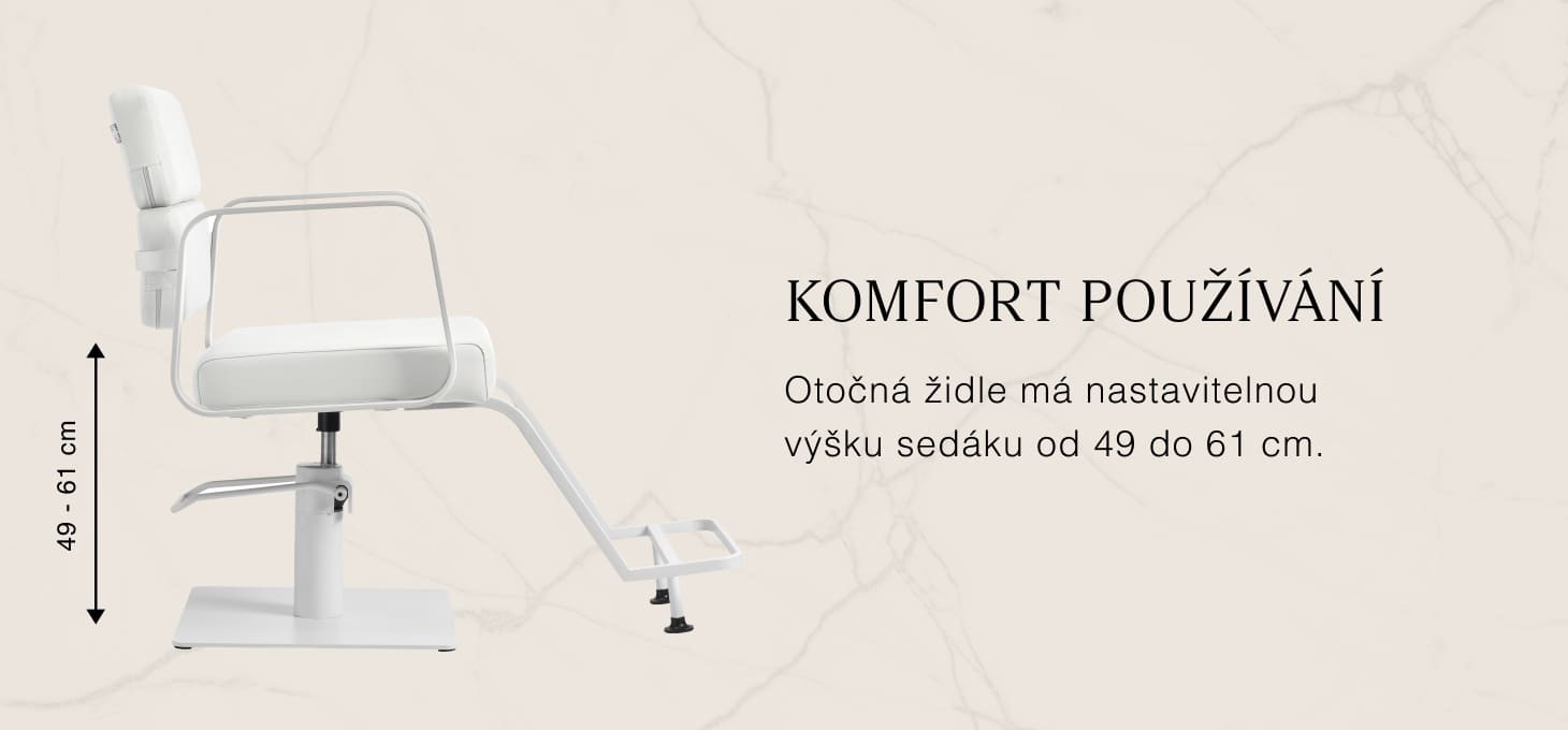 Odolný hydraulický zvedák umožňuje nastavit výšku sedadla v rozmezí 49-61 cm - a to i v případě, že klient na židli sedí. Poskytuje ergonomičtější pracovní prostředí, protože umožňuje nastavit úroveň sedadla podle výšky klienta i kadeřníka. Vizuálně zajímavé opěradlo umožňuje pohodlnou polohu a poskytuje vynikající oporu zad, což je důležité zejména při několikahodinových ošetřeních. Velkým plusem tohoto modelu je otvor ponechaný mezi opěradlem a sedákem. Usnadňuje udržování čistoty v salonu, protože umožňuje snadné vymetení vlasů ze všech koutů křesla. To umožňuje efektivnější přípravu pracoviště mezi jednotlivými klienty.